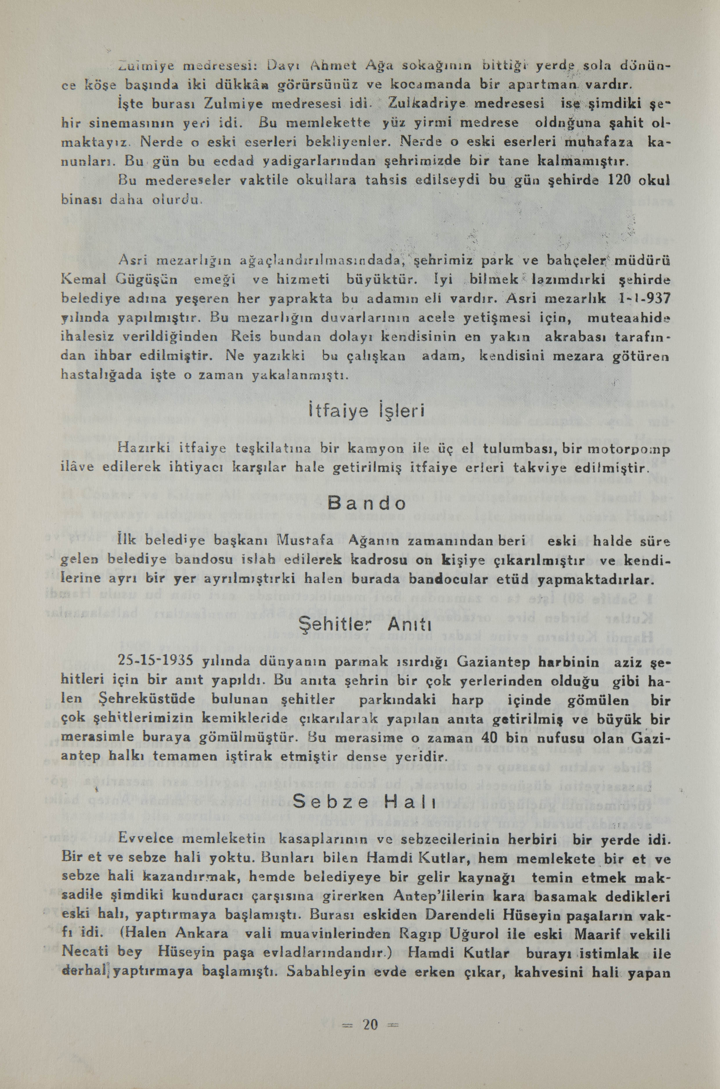 İşte bu da yeni reisin diğer bir inkilabı veya hamlesidir. Bugün İnönü Caddesi'nin üzerinde durur ve yönünüzü güneye çevirecek olursanız önünüzde koca bir şehir görürsünüz. İşte burası bu reis zamanında temamen mezarlıktı. Bir de vaktin taassup ve zihniyetini, halkında mezarlıkları üzerindeki titizlik ve hassasiyetini düşünecek olursak, bu koca mezarlığın lağvile asrî mezarlığa götürülmesinin güçlüğünü taktir edeceksiniz ([1]) Bundan başka o zaman Antep halkı arasında, burada çam yetişmez kanaati vardı.
