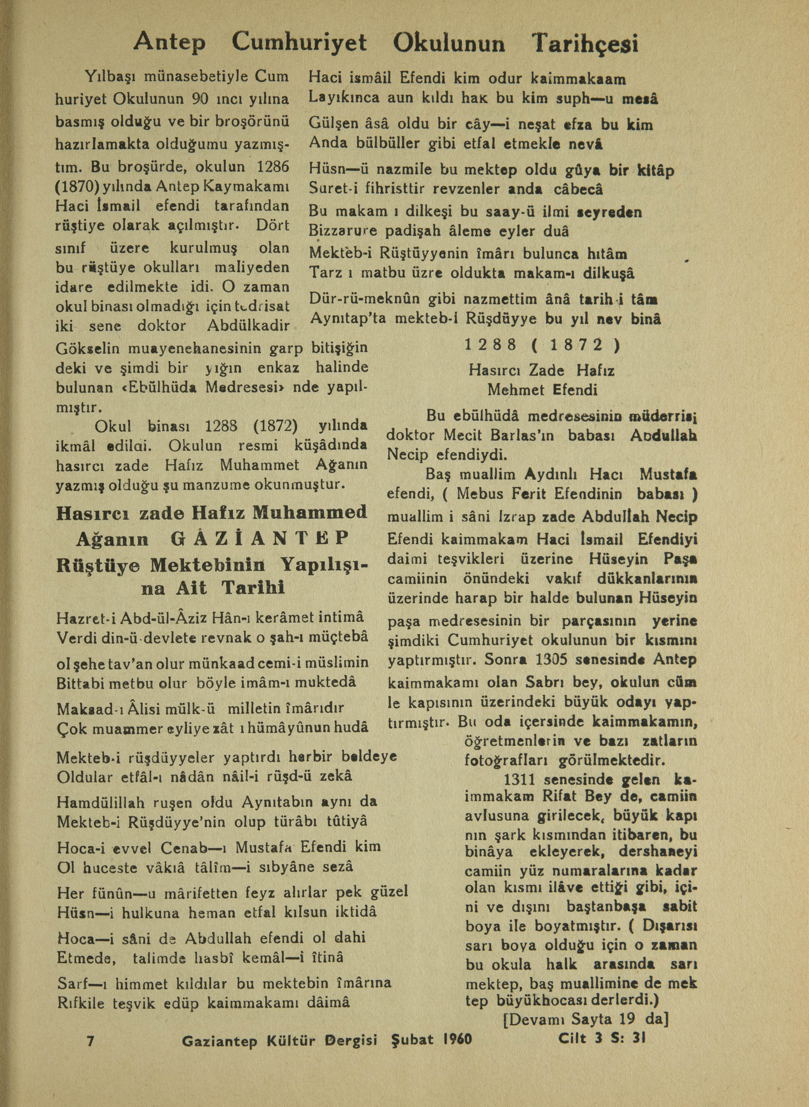 Yılbaşı münasebetiyle Cumhuriyet Okulunun 90 ıncı yılına basmış olduğu ve bir broşürünü hazırlamakta olduğumu yazmıştım. Bu broşürde, okulun 1286 (1870) yılında Antep Kaymakamı Haci İsmail Efendi tarafından rüştiye olarak açılmıştır. Dört sınıf üzere kurulmuş olan bu rüştüye okulları maliyeden idare edilmekte idi. O zaman okul binası olmadığı için tedrisat iki sene doktor Abdulkadir Gökselin muayenehanesinin garp bitişiğindeki ve şimdi bir yığın enkaz halinde bulunan “Ebülhüda Medresesi”nde yapılmıştır.