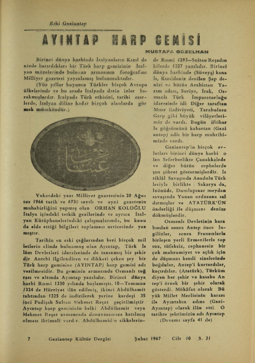 Tarihin en eski çağlarından beri birçok milletlerin elinde bulunmuş olan Ayıntap, Türk İslâm Devletleri idarelerinde de tanınmış bir şehirdir. Antebi ilgilerdiren ve dikkati ceken şey bir Türk Harp gemisine (AYINTAP) harp gemisi adı verilmesidir. Bu geminin armasında Osmanlı Tuğrası ve altında Ayıntap yazılıdır. Birinci dünya harbi Rumi 1330 yılında başlamıştı. 10 Temmuz 1324’de Hürriyet ilân edilmiş, ikinci Abdülhamit tahtından 1325 de indirilerek yerine kardeşi 35’inci Padişah Sultan Mehmet Reşat geçirilmiştir. Ayıntap harp gemisinin belki Abdülhamit veya Mehmet Reşat zamanında donanmamıza katılmış olması ihtimali vardır. Abdülhamid’in sikkelerinde Rumi 1293- Sultan Reşadınkilerde 1327 yazılıdır. Birinci dünya harbinde (Süveyş) kanalı, Kızıldeniz denilen Şap denizi ve bütün Arabistan Yarımadası, Suriye, Irak, Osmanlı Türk İmparatorluğu idaresinde idi. Diğer taraftan Mısır Hıdiviyeti, Tarabulusu Garp gibi büyük vilâyetlerimiz de vardı. Bugün iftiharla göğsümüzü kabartan (Gaziantep) adlı bir harp muhribimizde vardı.