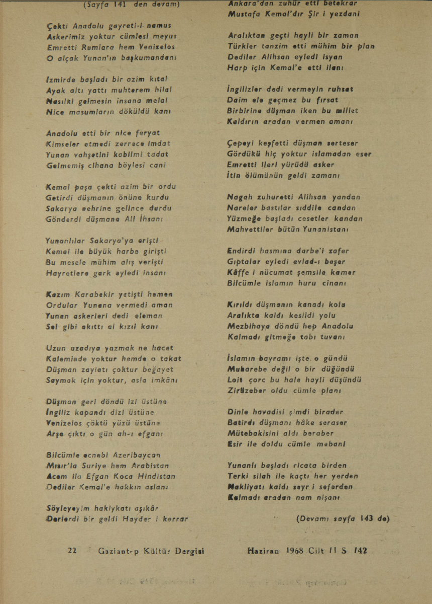 Defterin iç sayfalarında iki şiir yer almaktadır. Birincisi 2-5 ci sayfaları kaplayan 4 mısralı 6 cı sayfaya taşan 84 mısralık bir destandır. Hecenin 6-5 vezniyle yazılmıştır. Bu parçanın altında 16 teşrinevvel 338 tarihinden sonra “Gaziantep’te Ehlicefa Mh. den Bulguroğlu’’ yazılı olup bunun altında mühür gibi güzel bir imza var. İmzayı ( İbrahim Lebep) diye okudum. Ayrıca destanın kıt’asında 3. cü mısrada bu adını (İbrahim Lebep) olarak açıklıyor.