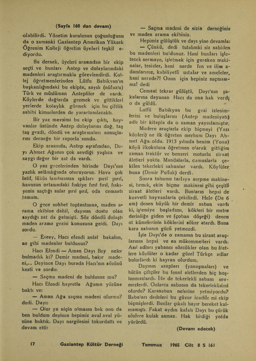 Osmanlı ülkesinde, ikinci meşrutiyetin ilânından sonra bir kımıldanma, bir uyanma oldu. Her alanda, ulusu kalkındırma için dernekler, dernekler kuruldu harıl harıl çalışmalar başladı. Bu hıza paralel olarak Antep’te de bir (Maden Arama Cemiyeti) ortaya çıktı. Cemiyete cins ve mezhep farkı gözetmiyerek her sınıftan kişiler üye olabilirdi. Yönetim kurulunun çoğunluğunu da o zamanki Gaziantep Amerikan Yüksek Öğrenim Kolleji öğretim üyeleri teşkil ediyordu.
