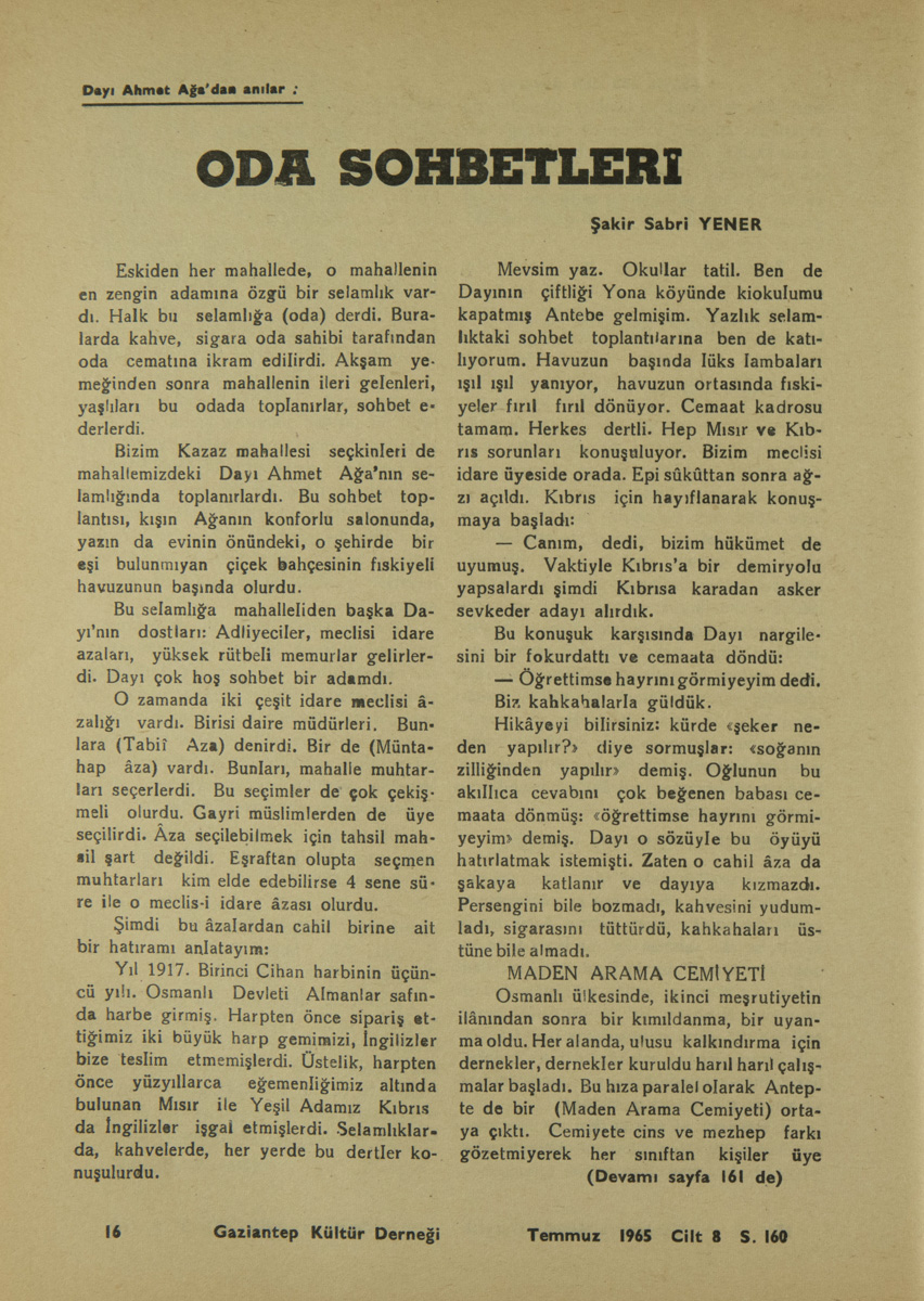Mevsim yaz. Okullar tatil. Ben de Dayı’nın çiftliği Yona köyündeki okulumu kapatmış Antebe gelmişim. Yazlık selamlıktaki sohbet toplantılarına ben de katılıyorum. Havuzun başında lüks lambaları ışıl ışıl yanıyor, havuzun ortasında fıskiyeler fırıl fırıl dönüyor. Cemaat kadrosu tamam. Herkes dertli. Hep Mısır ve Kıbrıs sorunları konuşuluyor. Bizim meclisi idare üyesi de orada. Epi sükûttan sonra ağzı açıldı. Kıbrıs için hayıflanarak konuşmaya başladı: