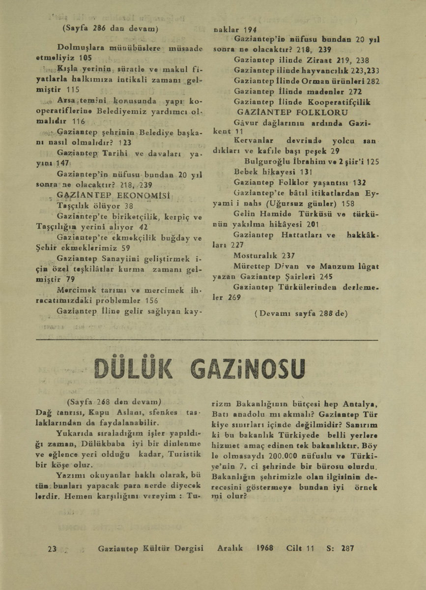Şöyle bir Dülük gazinosu düşünüyorum. Yanyana iki salon. Biri kahve pastane gibi daha çok dinlenme yeri. Öbürü içkili lokanta. Her iki salonun önünde ayni nitelikte bahçeleri. Başpı- nar’dan alınacak temiz su ve önünde bir havuz. Halkın ufak tefek alış veriş yapması için bir iki bakkal dükkânı.