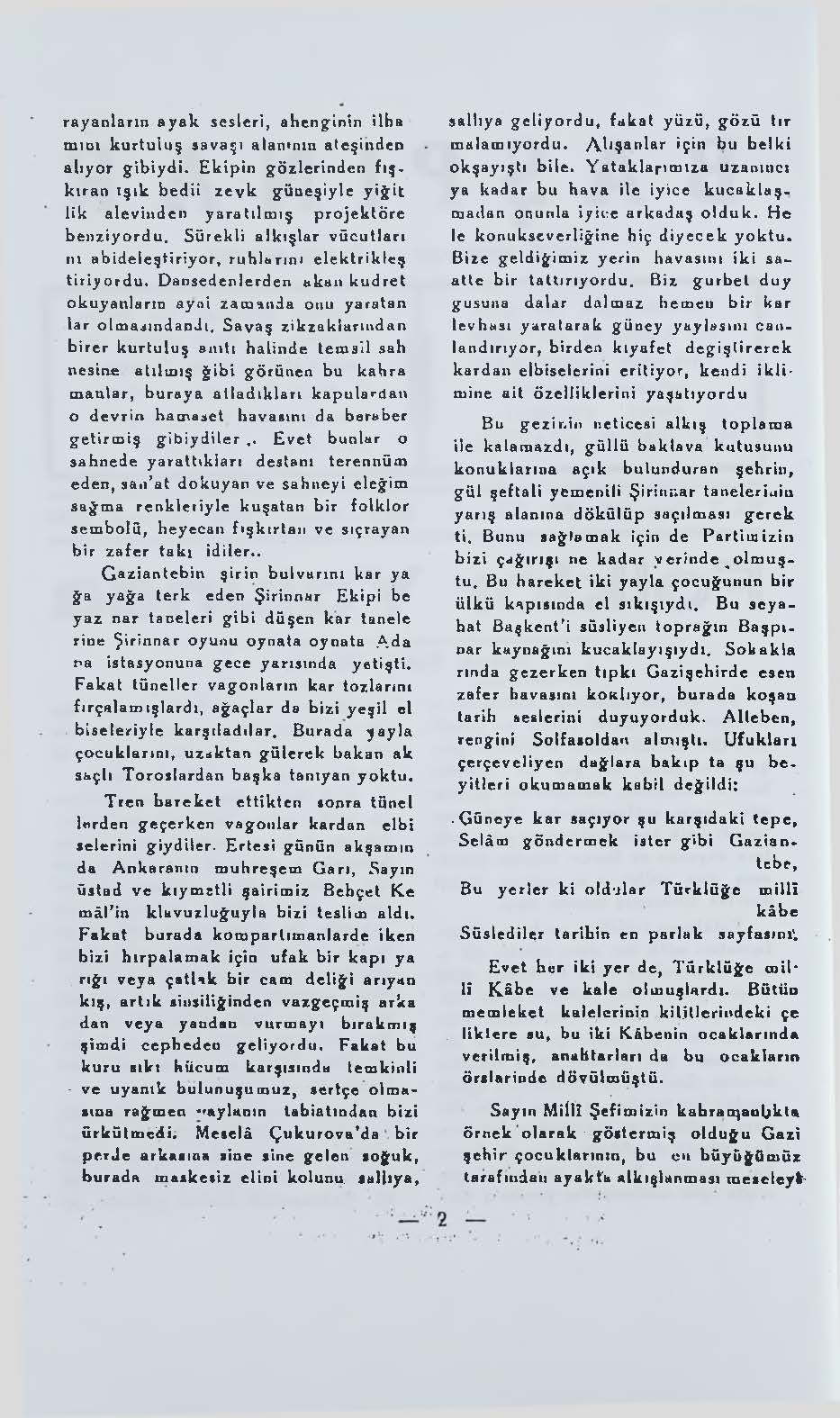 Tren hareket ettikten sonra tünellerden geçerken vagonlar kardan elbiselerini giydiler. Ertesi günün akşamında Ankara’nın muhteşem garı, sayın üstat ve kıymetli şairimiz Behçet Kemal’in kılavuzluğuyla bizi teslim aldı. Fakat burada kompartımanlarda iken bizi hırpalamak için ufak bir kapı yarığı veya çatlak bir cam deliği arayan kış. Artık sinsiliğinden vazgeçmiş arkadan veya yandan vurmayı bırakmış şimdi cepheden geliyordu. Fakat bu kuru sıkı hücum karşısında temkinli ve uyanık bulunuşumuz, sertçe olmasına rağmen aylanın tabiatından bizi ürkütmedi. Mesela Çukurova’da bir perde arkasına sine sine gelen soğuk, burada maskesiz elini kolunu salıya sallıya geliyordu, fakat yüzü, gözü tırmalamıyordu. Alışanlar için bu belki okşayıştı bile. Yataklarımıza uzanıncaya kadar bu hava ile iyice kucaklaşmadan onunla iyice arkadaş olduk. Hele konukseverliğine hiç diyecek yoktu. Bize geldiğimiz yerin havasını iki saatte bir tattırıyordu. Biz gurbet duygusuna dalar dalmaz hemen bir kar levhası yarılarak güney yaylasını canlandırıyor, birden kıyafet değiştirerek kardan elbiselerini eritiyor, kendi iklimine ait özelliklerini yaşatıyordu.