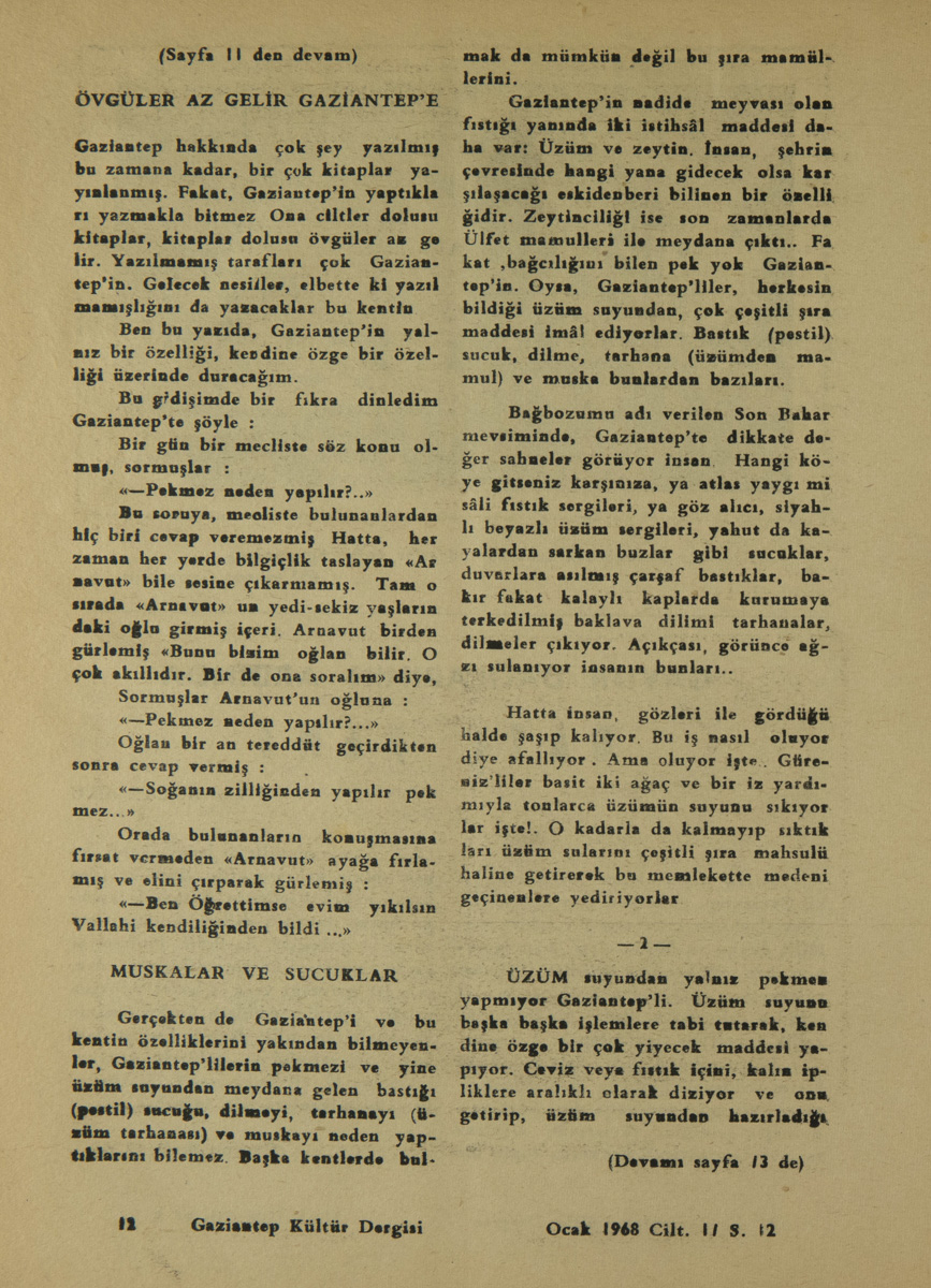 ÜZÜM suyundan yalnız pekmez yapmıyor Gaziantepli. Üzüm suyunu başka başka işlemlere tabi tutarak, kendine özge bir çok yiyecek maddesi yapıyor. Ceviz veya fıstık içini, kalın ipliklere aralıklı olarak diziyor ve onu getirip, üzüm suyandan hazırladığı özel karışımın içine batırıyor, sonra da bir ağaca yan yana bağladıktan sonra kurumaya terkediyor. Her boğu munu ayrı ayrı ısırıp, ayrı ayrı yiyor insan bu sucuğu. Bilmeyenler, onca şıra yiyeceklerini sanıyorlar. Ama, şıranın altından fıstık veya ceviz içi geldimi insanın ağzına, işte o zaman tadından doyulmuyor. Her ısırmada ipliği süyüm süyüm çekiliyor sucuğun, boğum boğum sökülüyor sucuklar..