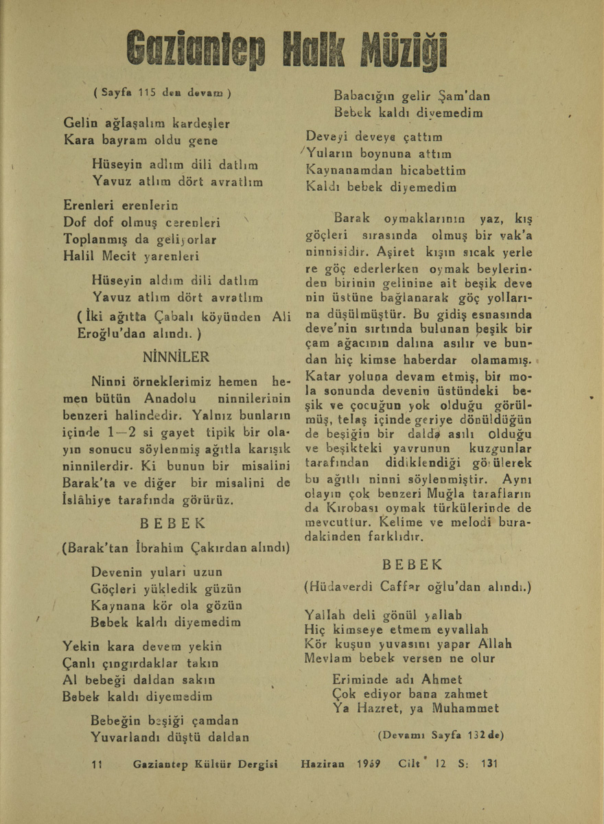 Ninni örneklerimiz hemen hemen bütün Anadolu ninnilerinin benzeri halindedir. Yalnız bunların içinde 1-2’si gayet tipik bir olayın sonucu söylenmiş ağıtla karışık ninnilerdir. Ki bunun bir misalini Barak’ta ve diğer bir misalini de İslâhiye tarafında görürüz.