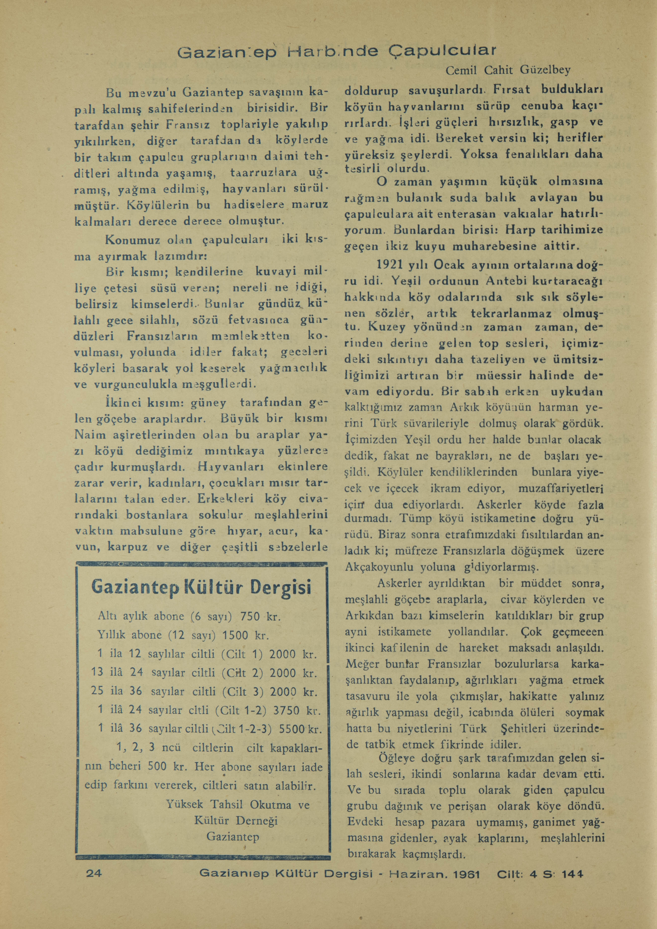Bu mevzu’u Gaziantep savaşının kapalı kalmış sahifelerinden birisidir. Bir tarafdan şehir Fransız toplariyle yakılıp yıkılırken, diğer tarafdan da köylerde bir takım çapulcu gruplarının daimi tehditleri altında yaşamış, taarruzlara uğramış, yağma edilmiş, hayvanları sürülmüştür. Köylülerin bu hadiselere maruz kalmaları derece derece olmuştur.