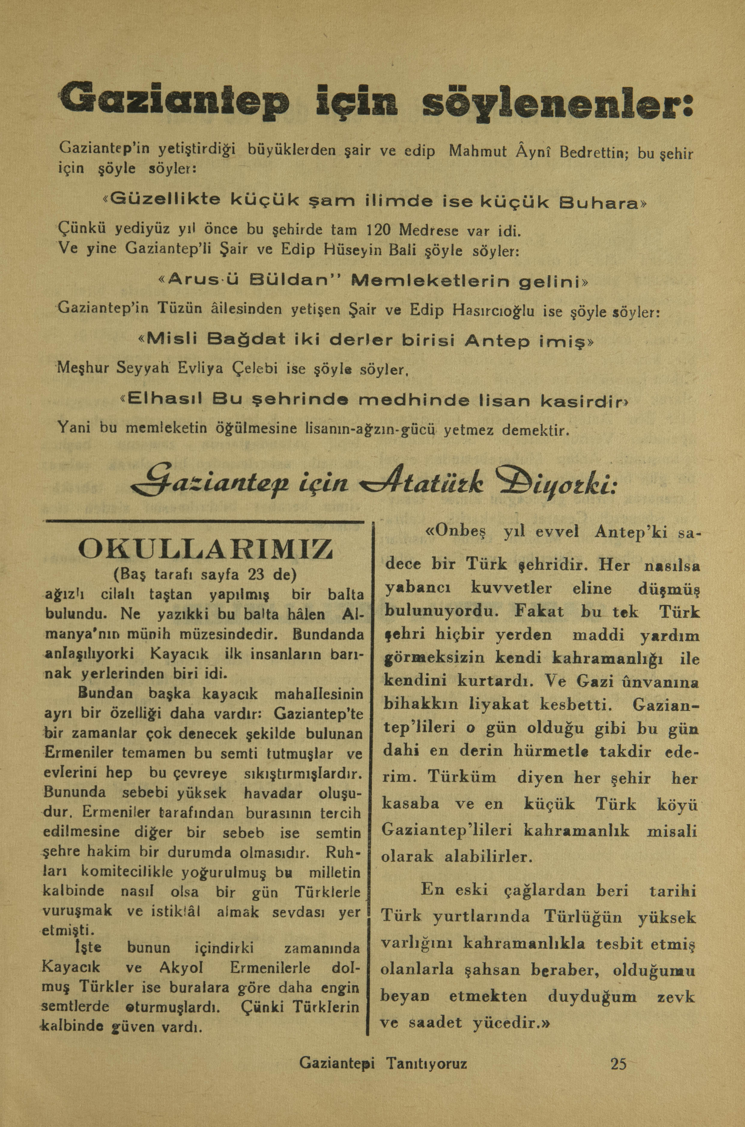 Gaziantep’in yetiştirdiği büyüklerden şair ve edip Mahmut Âynî Bedrettin bu şehir için şöyle söyler: