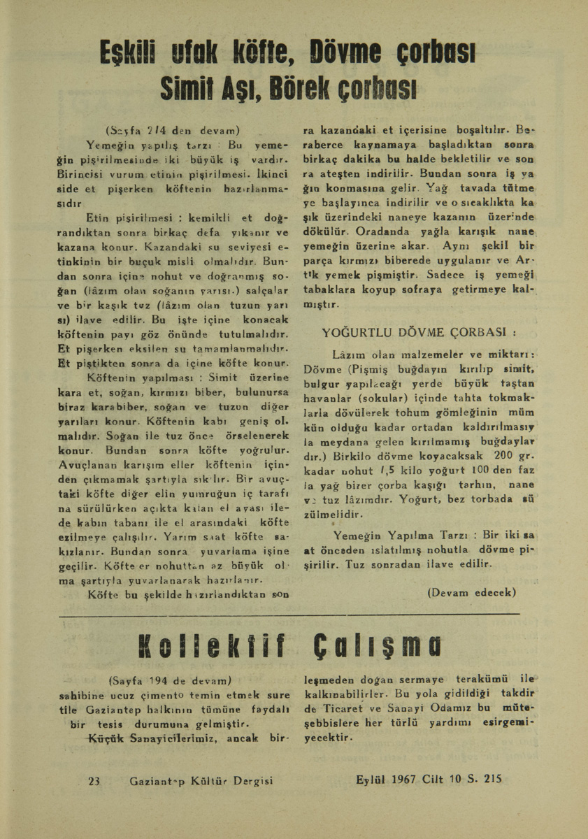 YOĞURTLU DÖVME ÇORBASI : Lâzım olan malzemeler ve miktarı: Dövme (Pişmiş buğdayın kırılıp simit, bulgur yapılacağı yerde büyük taştan havanlar (sokular) içinde tahta tokmaklarla dövülerek tohum gömleğinin mümkün olduğu kadar ortadan kaldırılmasıyla meydana gelen kırılmamış buğdaylardır.) Bir kilo dövme koyacaksak 200 gr. kadar nohut, 5 kilo yoğurt 100 den fazla yağ birer çorba kaşığı tarhın, nane ve tuz lâzımdır. Yoğurt, bez torbada süzülmelidir.
