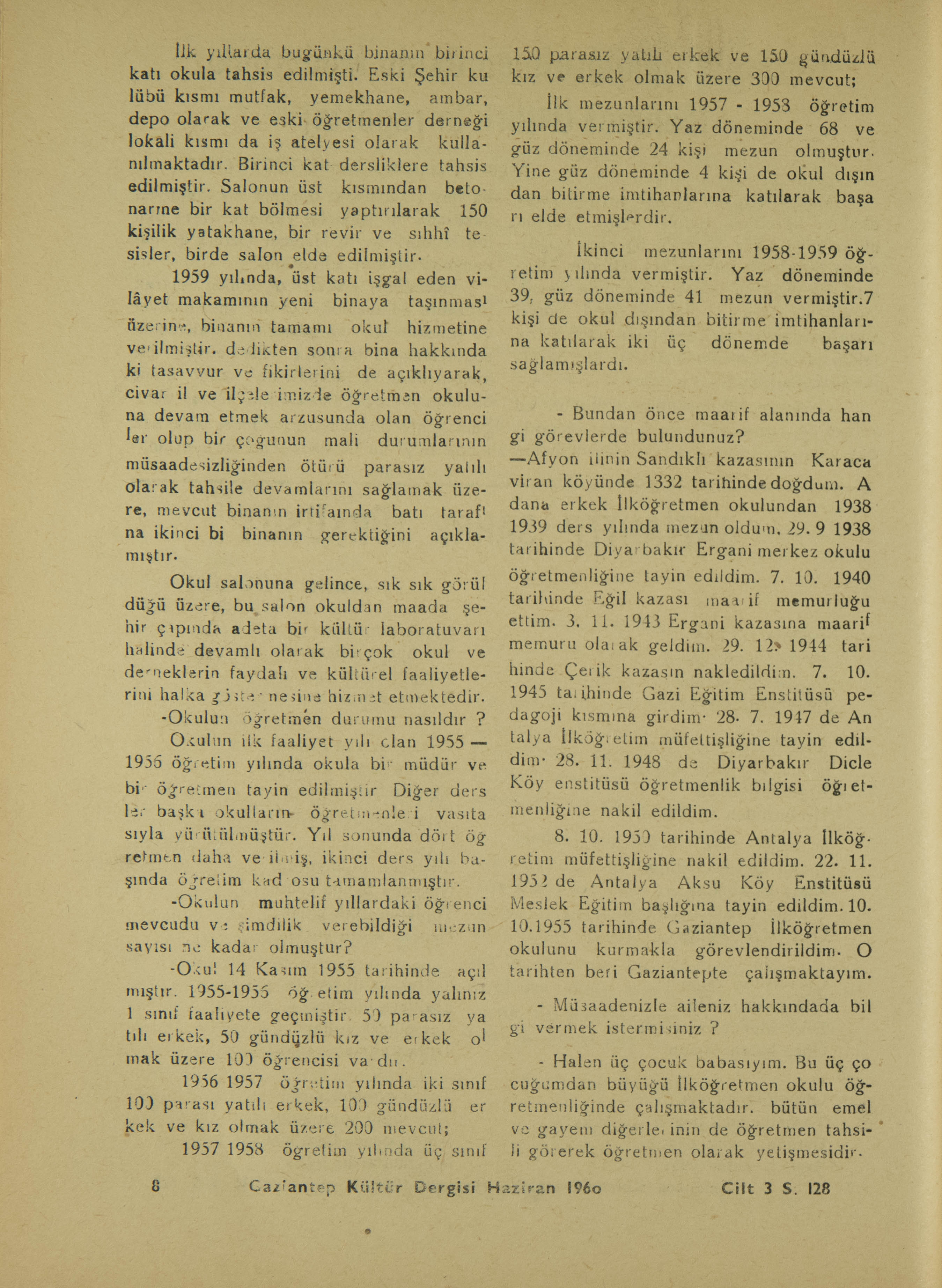 Gaziantep İlköğretmen okulunun kuruluşu 14 Kasım 1955 tarihinde olmakla beş yıllık bir tarihçesi vardır. Okulun bu beş yıl içindeki durumu ve faaliyeti hakkında bir röportaj yapmak üzere okulun Müdürü sayın Mehmet Öztürk’ü makamında ziyaret ediyorum.