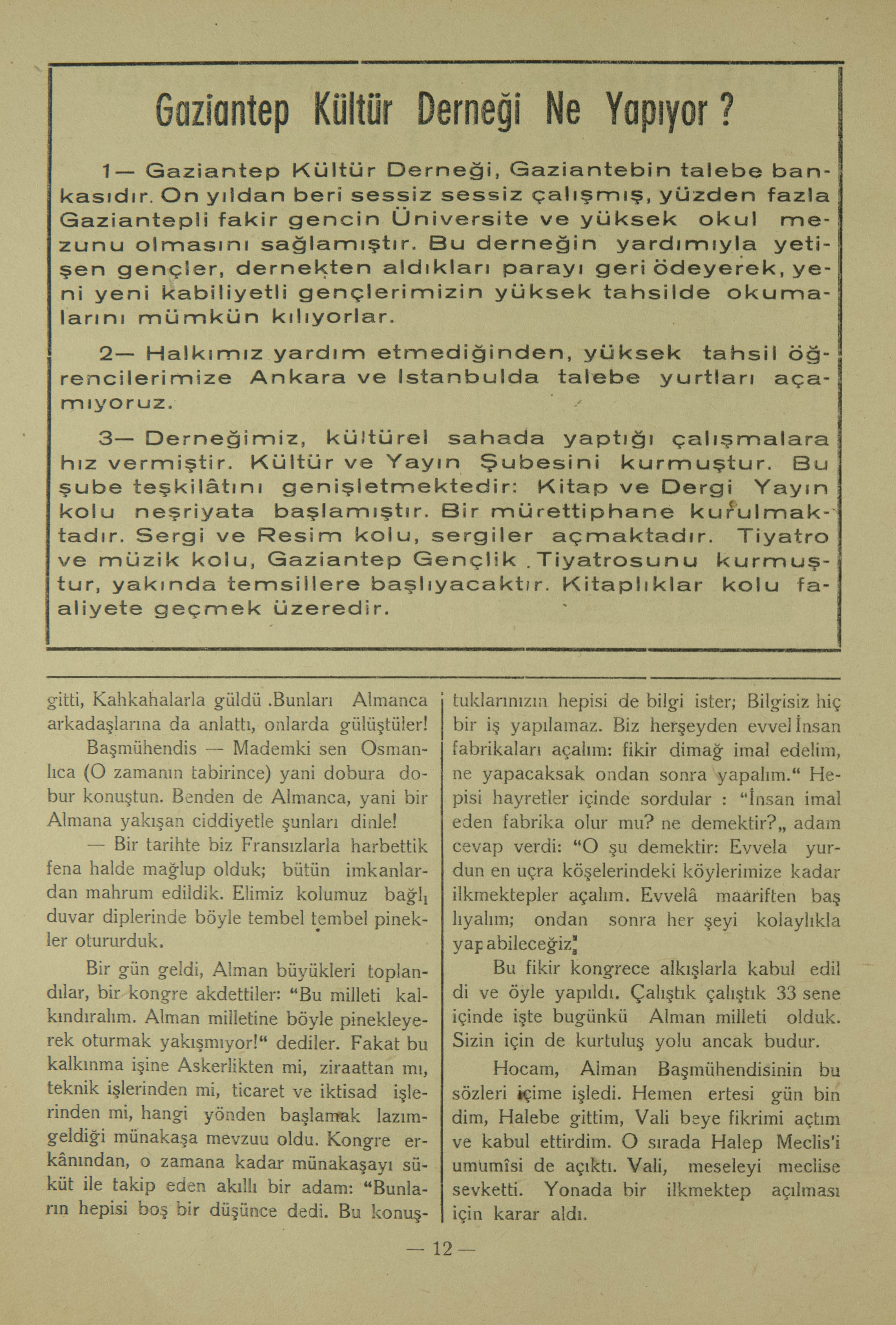 1- Gaziantep Kültür Derneği, Gaziantebin talebe bankasıdır. On yıldan beri sessiz sessiz çalışmış, yüzden fazla Gaziantepli fakir gencin üniversite ve yüksek okul mezunu olmasını sağlamıştır. Bu derneğin yardımıyla yetişen gençler, dernekten aldıkları parayı geri ödeyerek, yeni yeni kabiliyetli gençlerimizin yüksek tahsilde okumalarını mümkün kılıyorlar.