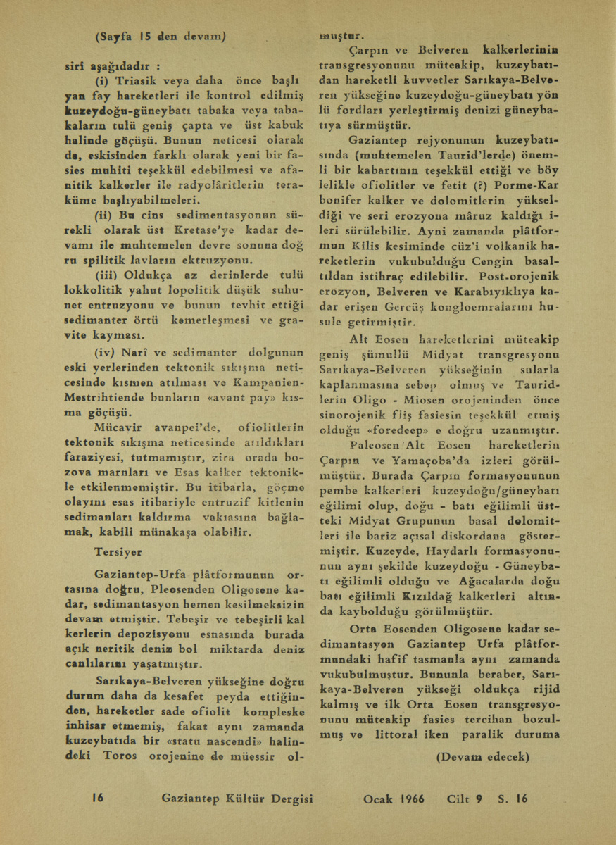 (i) Triasik veya daha önce başlıyan fay hareketleri ile control edilmiş kuzeydoğu-güneybatı tabaka veya tabakaların tulü geniş çapta ve üst kabuk halinde göçüşü. Bunun neticesi olarak da, eskisinden farklı olarak yeni bir fasies muhiti teşekkül edebilmesi ve afanitik kalkerler ile radyolâritlerin teraküme başlıyabilmeleri.