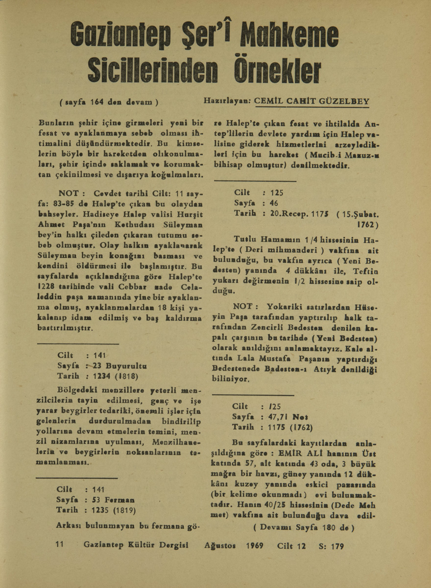 Antep’te bulunan attarlar Mahkemeye gelerek, dükânlarımızda fazla miktarda barut olup bu durum tehlikeli bulunduğundan, bugünden sonra 3 nügü kayseri, 3 nügü Antep barutu bulundurmak, bunları kabak içine koyarak akşamları da evimize götürüp sabahlayın getirmek üzere söz verdik dediler. 15 recep 1180