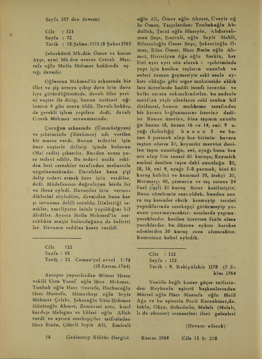 Antep’te yapıcılardan Mimar Hassa vekili Usta Yusuf oğlu Hacı Mehmet, Tonbak oğlu Hacı Mustafa, Hachacoğlu Hacı Mustafa, Mimarbaşı oğlu Seyit Mehmet Çelebi, Şekeroğlu Usta Mehmet Müzitoğlu Ahmet, Zemzemi usta, kızıl kardaşı Melegun ve kölesi oğlu Allah verdi ve ayrıca merkepçiler taifesinden Hacı Emin, Güceli Seyit Ali, Emirali oğlu Ali Ömer oğlu Ahmet, Üveyis oğlu Ömer, Taşcılardan: Tonbakoğlu Abdullah, Terzi oğlu Hüseyin, Abdurrahman Beşe, Emirali oğlu Ali, Ömer oğlu Ahmet, Üveyis oğlu Ömer, Taşçılardan: Tonbakoğlu Abdullah, Terzi oğlu Hüseyin, Abdurrahman Beşe, Emirali, oğlu Seyit Mahli, Silmecioğlu Ömer Beşe, Şekercioğlu Ömer, Köse Ömer, Hacı Emin oğlu Ahmet, Hristiyan ağa oğlu Sarkiz, her biri ayrı ayrı söz alarak: “şehrimizde yapı için kesilen taşların uzunluk ve enleri zaman geçmesiyle eski usule aykırı olduğu gibi ırgat makuleside aldıkları ücretlerde haddi insafı tecavüz ve halkı zarara sokmaktadırlar, bu nedenle esnafıan yaşlı olanların eski usulnu bildirilmesi, bunun mahkeme tarafından bir karara bağlanmasını isteriz” dediler. Bunun üzerine, bina taşının uzunluğu bazen 18, bazen 16 ve 14, eni: 9 ayağı (kalınlığı) bazen 5 ve bazen 6 parmak olup her birinin havara taştan olursa 20, keymıht mervist denilen taşın uzunluğa, eni, ayağı buna benzer olup bin tanesi 60 kuruşu, Keymith amlesi denilen taşın dahi uzunluğu 20, 18, 16, eni 9, ayağı 7-8 parmak, bini 60 kuruş kahilci ve hamrnal 30, irekçi 30, Mermatçı 40, çamurcu ve taş tütene 24 Faal (işçi) 20 kuruş ücret kesilmiştir. Buna cümlemiz razı olduk, bundan sonra taş kesenler eksik kesıneyip tersini yaptıklarında merkepçi götürmeyip yonucu yontmayacaktır. Ustalarda yapmayacaklardır kesilen ücretten fazla alma yaraklardır, bu düzene aykırı hareket edenlerden 30 kuruş ceza alınacaktır. Kamumuz kabul eyledik.
