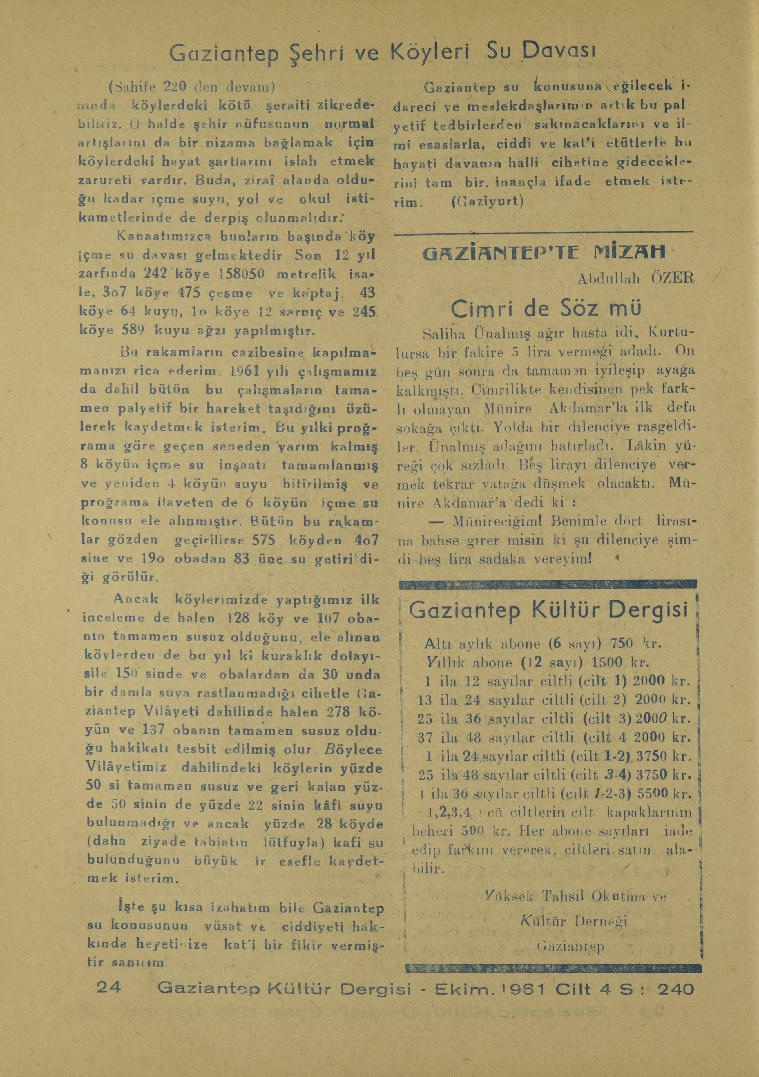 3) Gaziantep’in köy içme suları konusu da üzerinde hassasiyetle durulacak önemi haizdir. Gaziantep vilayeti dahilinde halen 575 köy ile bu köylere bağlı 190 oba mevcuttur, 1960 sayımına göre bu köy ve obalarda 239539 nüfus sakindir. Hemen şunu da kaydedelim ki 1960 yılı sayımında Gaziantep şehrinde nüfus artışı azamide dolaşırken köylerde durum aynı olmamıştır. 1955-1960 fasılasında şehir nüfusu yüzde 052,6 artış kaydederken merkeze bağlı köylerde yüzde 01 bir eksilme vukua gelmiştir. Böylece merkez köylerde vukua gelen yüzde 0 30’luk tabii artışın Gaziantep şehrine şirayet ettiği kolayca görülür. Gaziantep şehri yüzde 0 27,5’lik tabii artışına ilave olarak yüzde 0 11 merkez köylerden ve yüzde o 14, i vilayet köylerinden ve civarından temin edilmiştir. Elbette ki bu göçler muhtelif faktörlerin tesiri altındadır. Faktördeki merkezdeki sanayileşmenin cezbetme kudreti yanında köylerdeki kötü şeraiti zikredebiliriz. O halde şehir nüfusunun normal artışlarını da bir nizama bağlamak için köylerdeki hayat şartlarını islah etmek zarureti vardır. Buda, ziraî alanda olduğu kadar içme suyu, yol ve okul istikametlerinde de derpiş olunmalıdır.