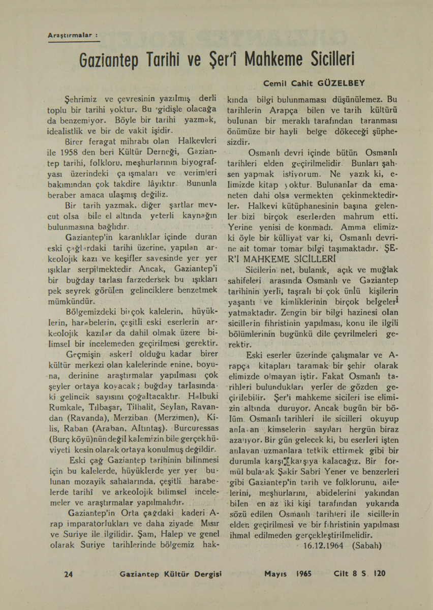 Eski eserler üzerinde çalışmalar ve Arapçı kitapları taramak bir şehir olarak elimizde olmayan iştir. Fakat Osmanlı tarihleri bulundukları yerler de gözden geçirilebilir. Şer’i mahkeme sicileri ise elimizin altında duruyor. Ancak bugün bir böIüm Osmanlı tarihleri ile sicilleri okuyup anla an kimselerin sayıları hergün biraz azalıyor. Bir gün gelecek ki, bu eserleri işten anlayan uzmanlara tetkik ettirmek gibi bir durumla karşı karşıya kalacağız. Bir formül bula’ak Şakir Sabri Yener ve benzerleri gibi Gaziantep’in tarih ve folklorunu, ailelerini, meşhurlarını, abidelerini yakından bilen en az iki kişi tarafından yukarıda sözü edilen Osmanlı tarihleri ile sicillerin elden geçirilmesi ve bir fihristinin yapılması ihmal edilmeden gerçekleştirilmelidir.