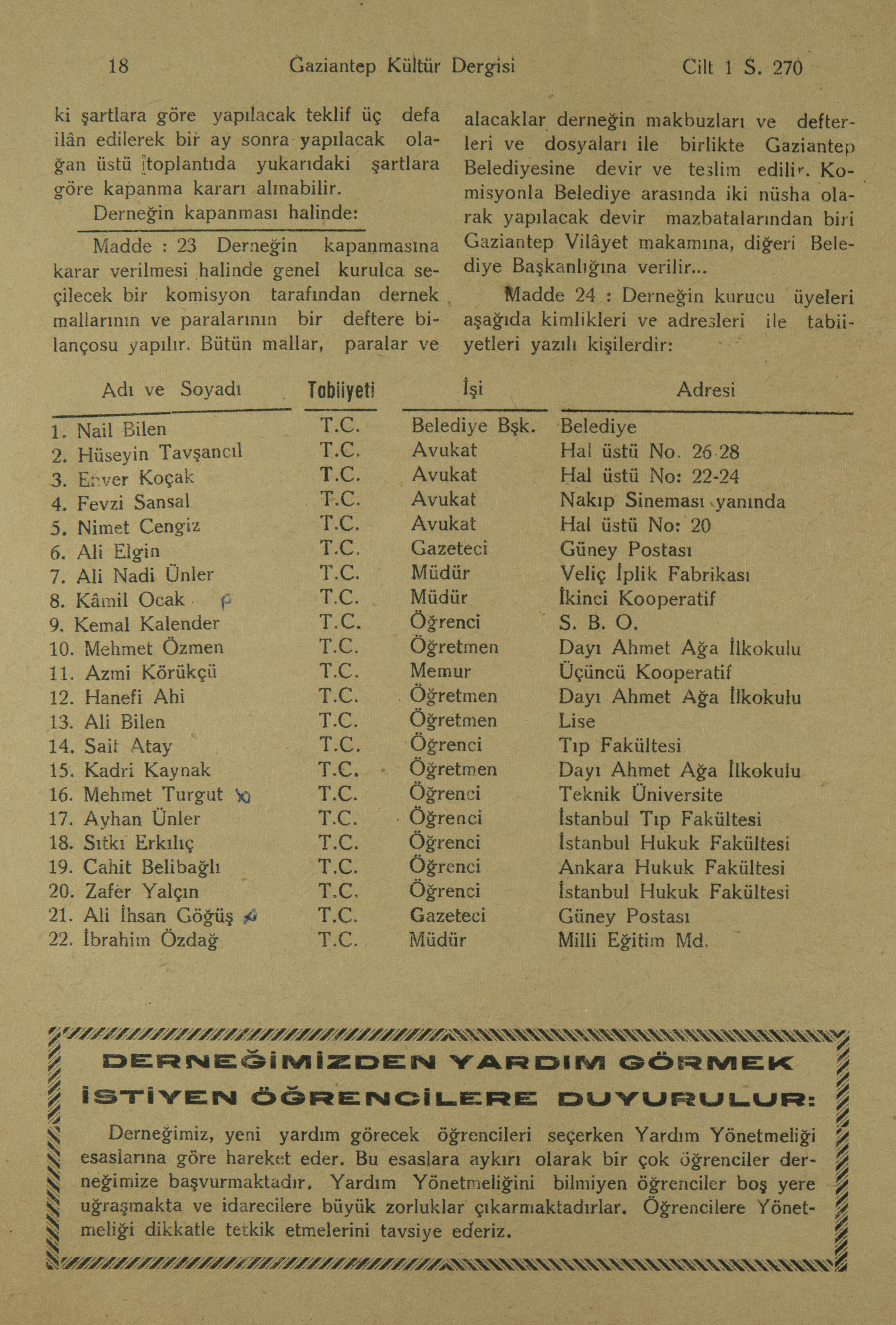Madde 23: Derneğin kapanmasına karar verilmesi halinde genel kurulca seçilecek bir komisyon tarafından dernek mallarının ve paralarının bir deftere bilançosu yapılır. Bütün mallar, paralar ve alacakları derneğin makbuzları ve defterleri ve dosyaları ile birlikte Gaziantep belediyesine devir ve teslim edilir komisyonla Belediye arasında iki nüsha olarak yapılacak devir mazbatalarından biri Gaziantep Vilayet makamına, diğeri Belediye Başkanlığına verilir…
