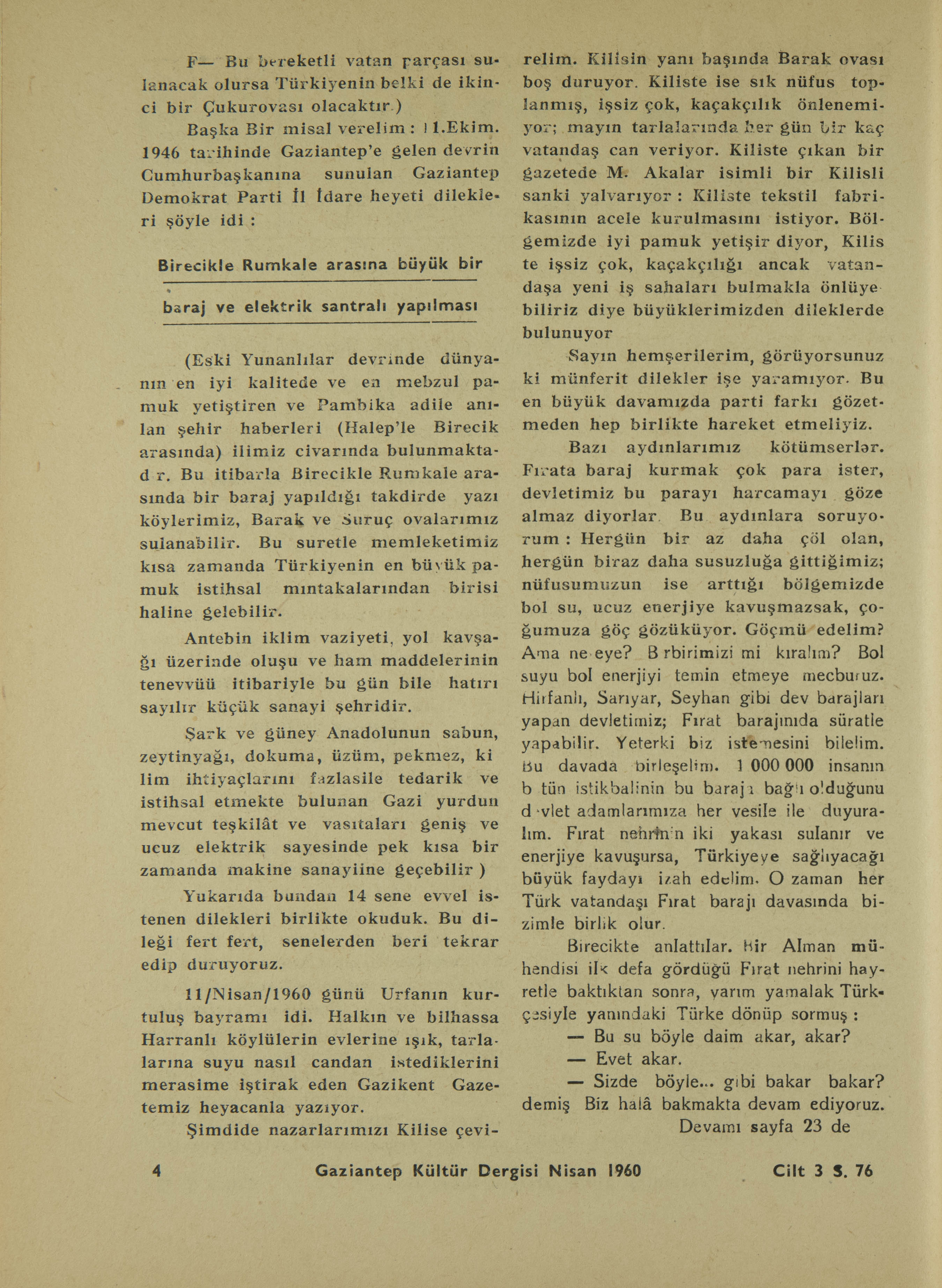 Bugüne kadar bol enerjiye ve bol suya kavuşmuş değilsek, bütün kabahat bizlerindir. Fırat barajı davasında hepimizin birlikte hareket etmesi gerekiyor. Münferit hareketlerin ise işe yaramadığını hadiseler isbat etmiştir. Mesela: 4 Mayıs 1946 tarihinde Gaziantep’e gelen Bayındırık Bakanına C.H.P İl İdare kurulu tarafından sunulan dilekleri birlikte okuyalım: