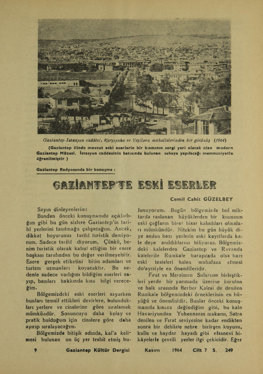 Bundan önceki konuşmamda açıkladığım gibi bu gün sizlere Gaziantep’in tarihî yerlerini tanıtmağa çalışacağım. Ancak, dikkat buyurunuz tarihî turistik demiyorum. Sadece tarihî diyorum, Çünkü, benim turistik olarak kabul ettiğim bir esere başkası tarafından bu değer verilmeyebilir. Esere gerçek etiketini bilim adamları ve turizm uzmanları koyacaktır. Bu nedenle sadece varlığını bildiğim eserleri sayıp, bazıları hakkında kısa bilgi vereceğim.