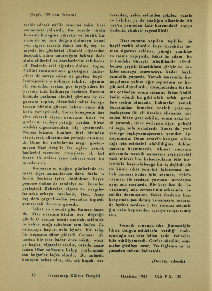 Fakat en önemli gün Ramaz başında iftar sırasının bizim eve düştüğü gündü. O zaman içerde mutfak, selâmlıkta kahve ocağı sabahtan tam kadro ile çalışmaya başlar, evin içinde bir telâş bir koşuşma sürer giderdi. Cemaat iftardan bir saat kadar önce sökün etmiye başlar, cigaralar sarılır, ortada hazırlanan iftar sofrasına bakıp yutkunmaktan boğazlar laçka olurdu. Bu anlarda konuşan pek az olur, sık sık kuşak aralarından, yelek cebinden çekilen saatlere bakılır, ya da yazlığın köşesinde Ahraz’ın yanından kale burcundaki topçu dedenin siluheti seyredilirdi.