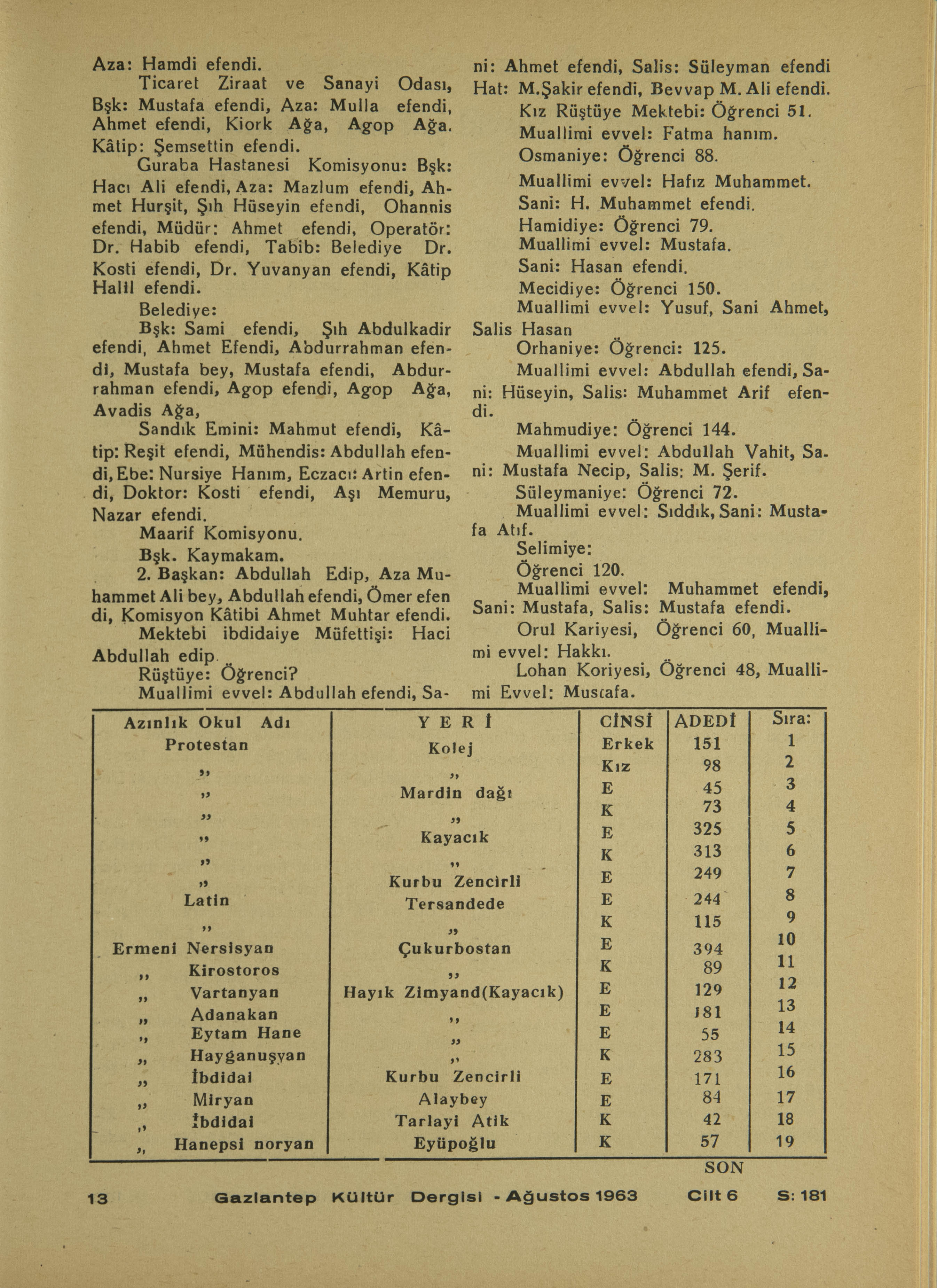 Aza: Zaifi Zade Mazlum, Hacı Halil ağa zade Ahmet Hilmi, Şıh Hüseyin efendi, Lionyan Ohannis efendi, Kendirciyan Hosep efendi, Bezciyan Habib efendi.