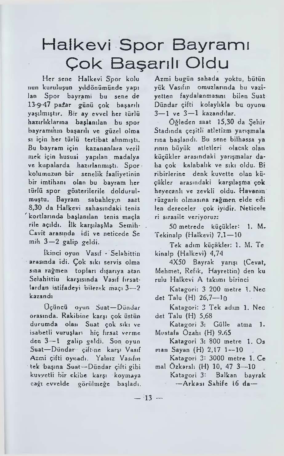 Her sene Halkevi Spor kolunun kuruluşun yıldönümüne yapılan Spor bayramı bu sene de 13-9-47 Pazar günü çok başarılı yaşılmıştır. Bir ay evvel her türlü hazırlıklarına başlanılan bu spor bayramının başarılı ve güzel olması için her türlü tertibat alınmıştı. Bu bayram için kazananlara verilmek için hususi yapılan madalya ve kupalarda hazırlanmıştı. Spor kolumuzun bir senelik faaliyetinin bir imtihanı olan bu bayram her türlü spor gösterilerile doldurulmuştu. Bayram sabahleyin saat 8.30 da halkevi sahasındaki tenis kotlarında başlanılan tenis maçlarile açıldı. İlk karşılaşma Semih - Cavit arasında idi ve neticede Semih 3-2 galip geldi.