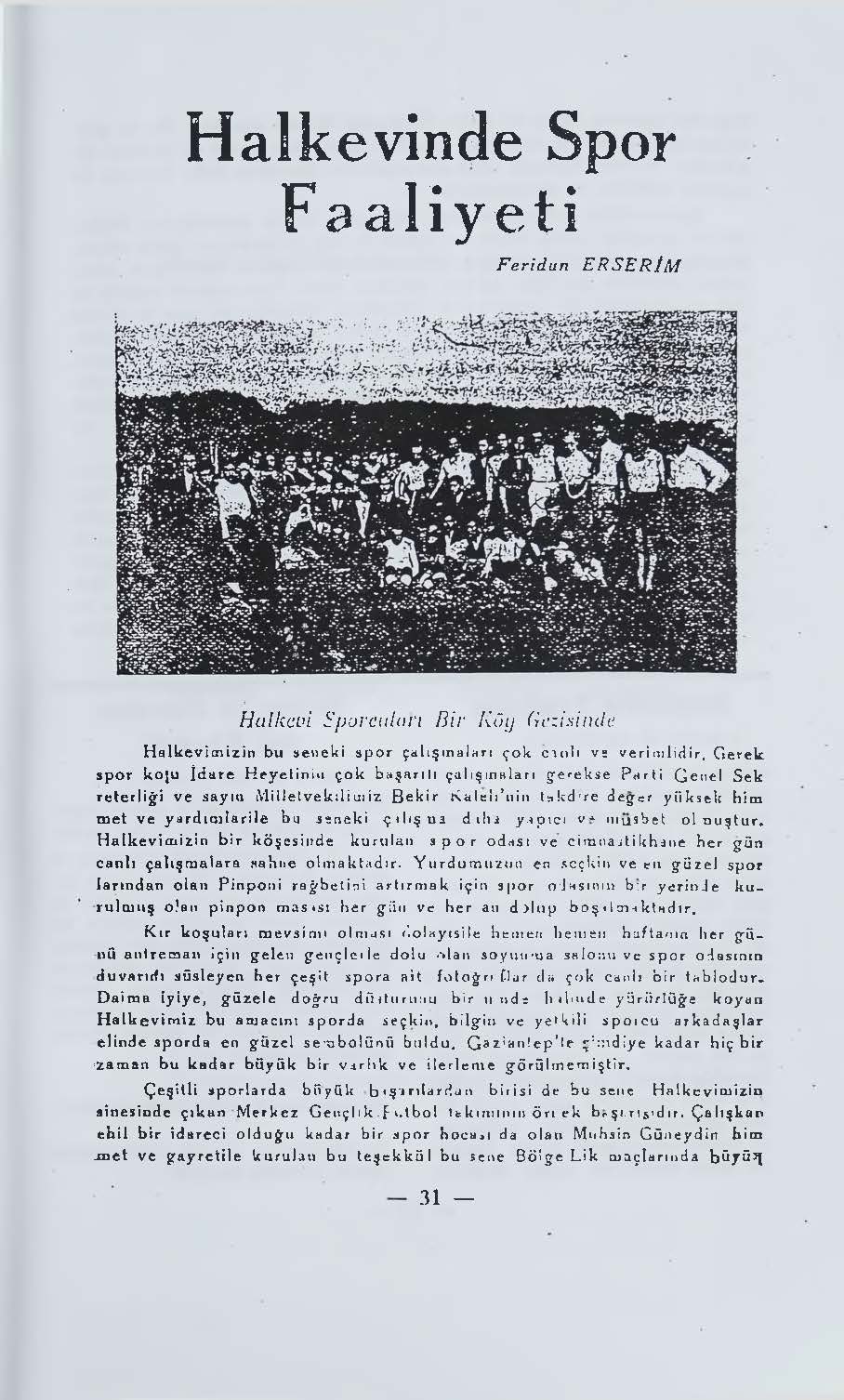 Halkevimiz bu seneki spor çalışmaları çok canlı ve verimlidir. Gerek spor kolu idare heyetinin çok başarılı çalışmaları gerekse parti genel sekreterliği ve sayın milletvekilimiz Bekir Kaleli’nin taktire değer yüksek himmet ve yardımlarile bu seneki çalışma daha yapıcı ve müsbet olmuştur. Halkevimizin bir köşesinde kurtulan spor odası ve cimnastikhane her gün canlı çalışmalara sahne olmaktadır. Yurdumuzun en seçkin ve en güzel sporlarından olan Pinponi rağbetini artırmak için spor odasının bir yerinde kurulmuş olan pinpon masası her gün ve her an dolup boşalmaktadır.