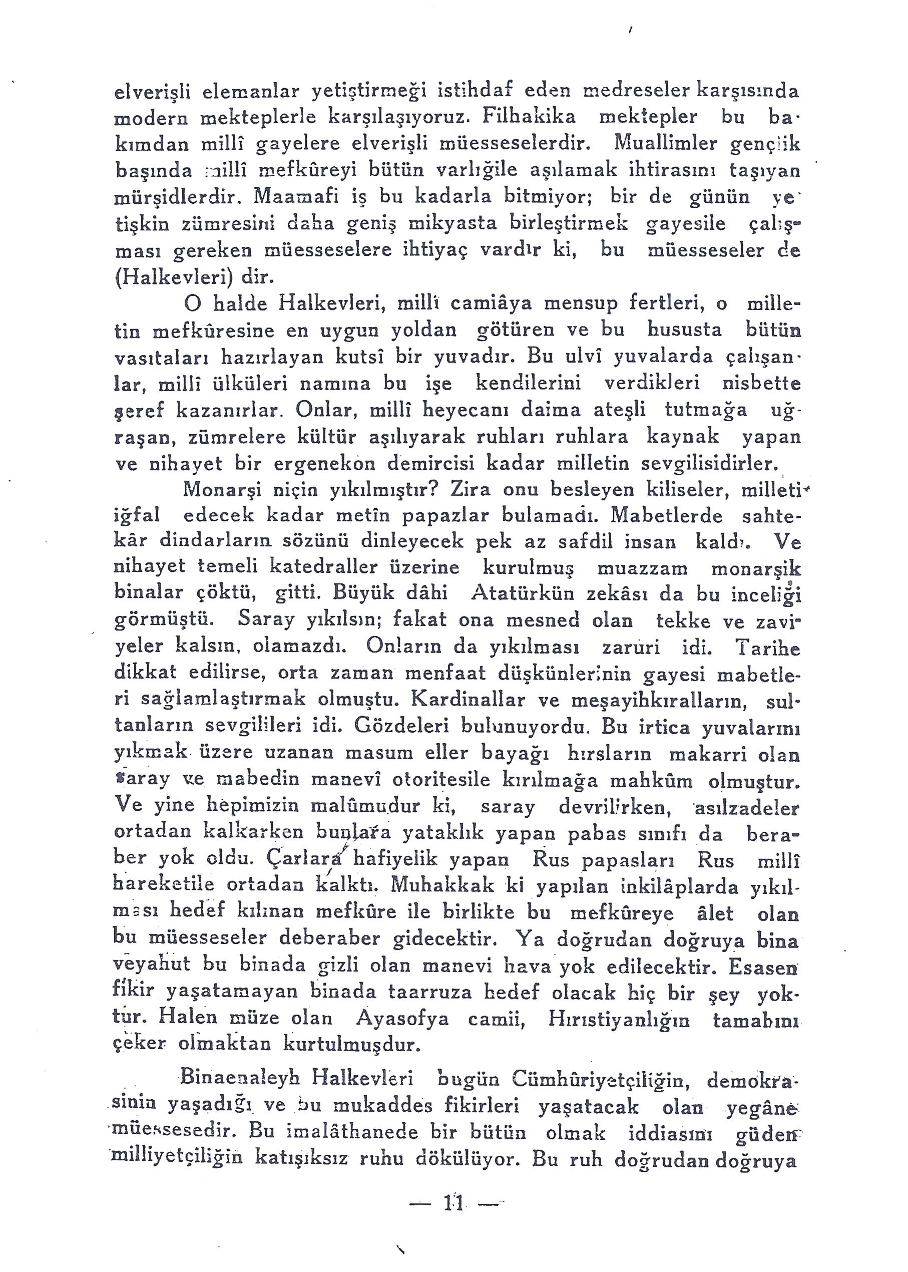 İslâm dini şarkta, Hıristiyanlık dini, garpte hakimsıiyetini tesis eylemiş bulunması ve halen payidar olmasının sebebini, cami ve kiliselerin mevcudiyetine ve burada imâmet vazifesini alanların hakkile gayelerine elverişli çalışmalarına bağlayabiliriz. İslâmlık veya Hıristiyanlık mefkûresi nereye ulaşmış ise, orada muhakkak ki bir cami veyahut bir kilise mevcutdur. Dinî ve beşerî gayeye elverişli elemanlar yetiştirmeği istihdaf eden medreseler karşısında modern mekteplerle karşılaşıyoruz. Filhakika mektepler bu bakımdan millî gayelere elverişli müesseselerdir. Muallimler gençlik başında millî mefkûreyi bütün varlığile aşılamak ihtirasını taşıyan mürşidlerdir, Maamafi iş bu kadarla bitmiyor; bir de günün yetişkin zümresini daha geniş mikyasta birleştirmek gayesile çalışması gereken müesseselere ihtiyaç vardır ki, bu müesseseler de (Halkevleri) dir.