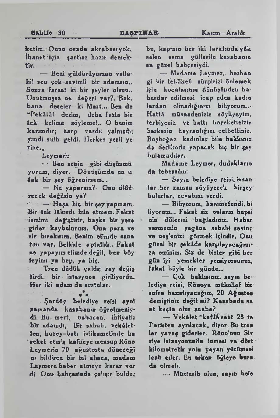 — Madame Leymer, herhangi bir tehlikeli sürprizi önlemek için kocalarının dönüşünden haberdar edilmesi icap eden kadınlardan olmadığınızı biliyorum. Hatta müsaadenizle söyleyeyim, terbiyeniz ve hattı haşekatinizle herkesin hayranlığını celp ettiniz. Boşboğaz kadınlar bile hakkınız da dedikodu yapacak hiç bir şey bulamadılar.