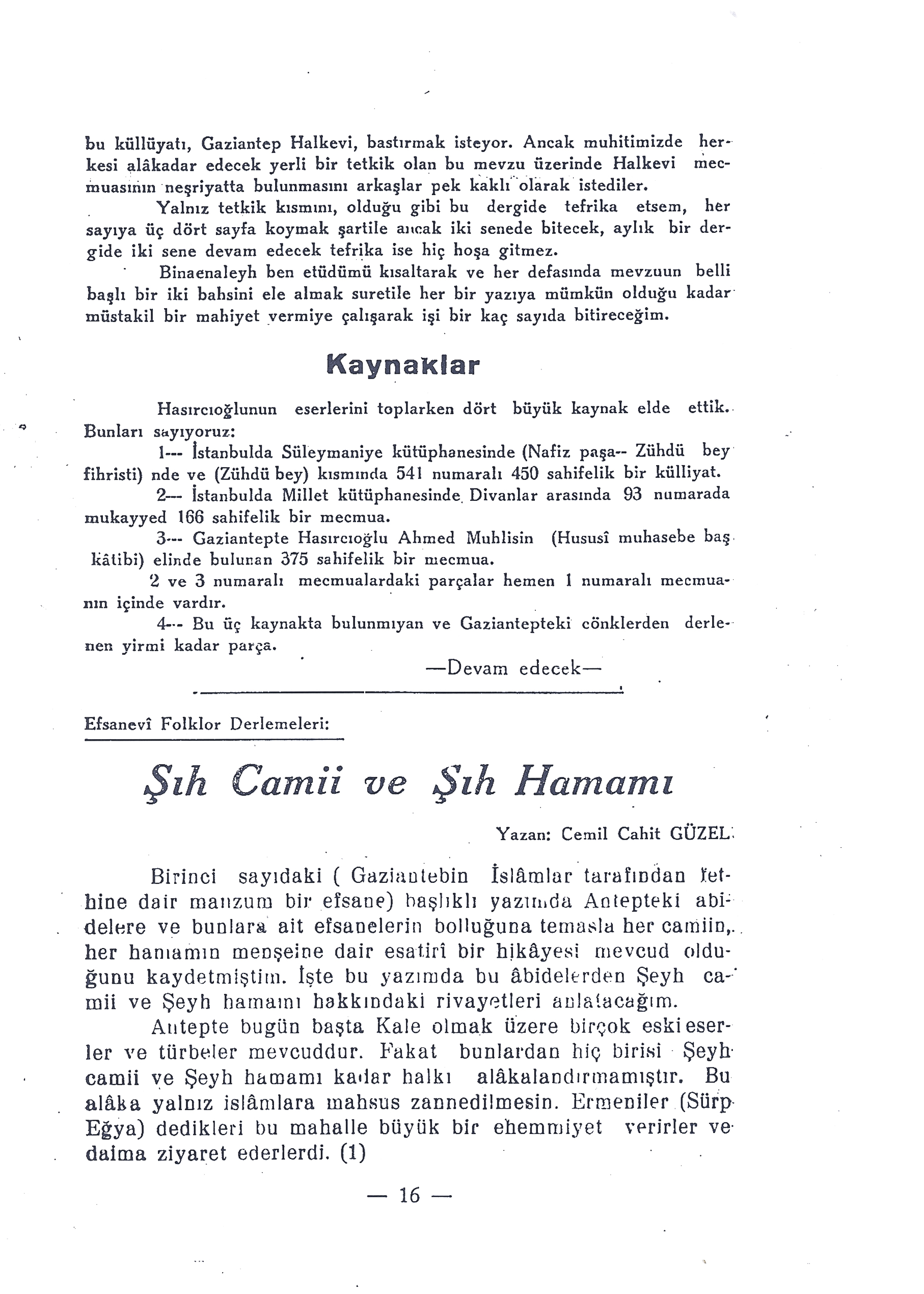 Etüdümle beraber beş altı yüz sahifelik büyük bir cild teşkil eden bu küllüyatı, Gaziantep Halkevi, bastırmak isteyor. Ancak muhitimizde herkesi alakadar edecek yerli bir tetkik olan bu mevzu üzerinde Halkevi mecmuasını neşriyatta bulunmasını arkaylar pek haklı olarak istediler.
