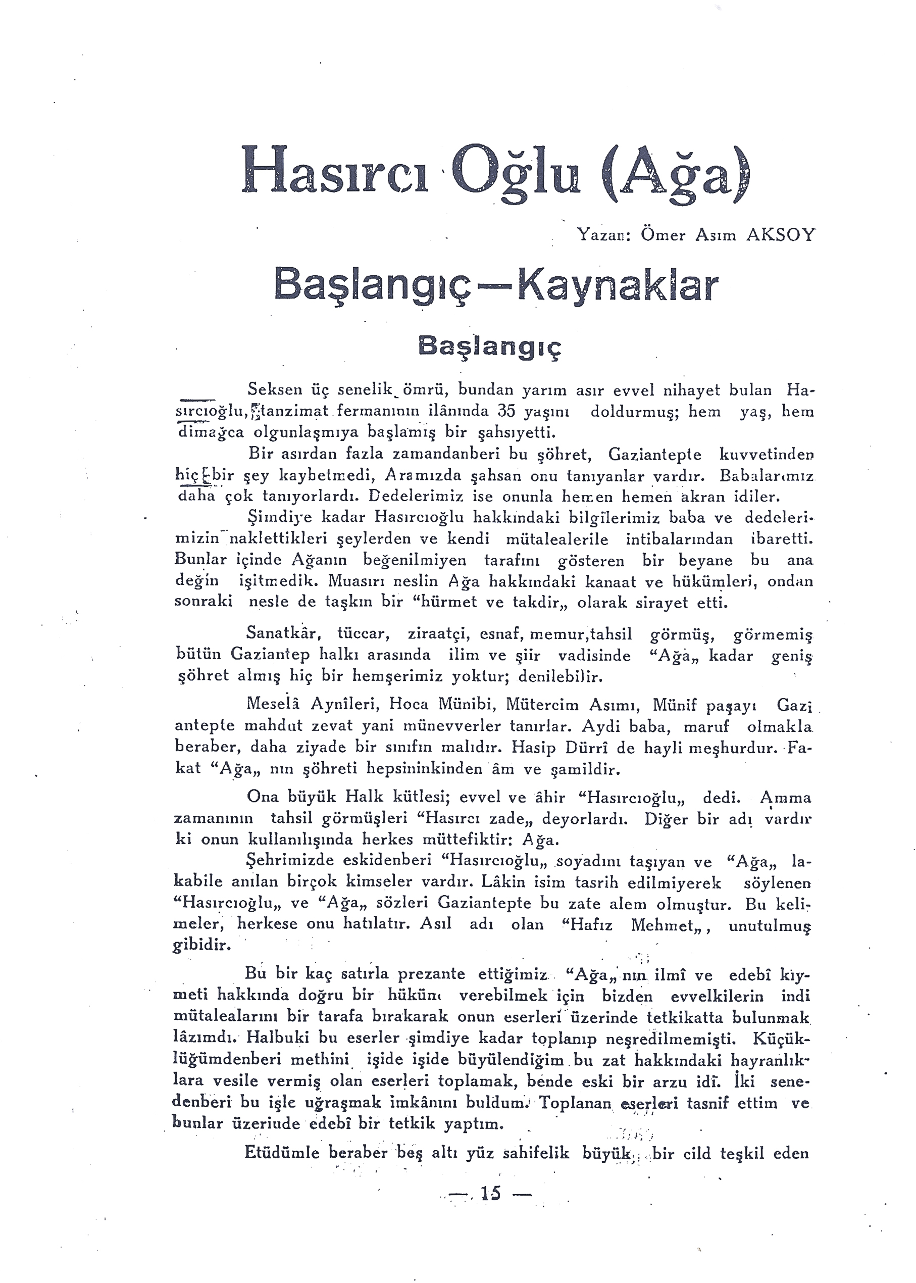 Meselâ Aynîleri, Hoca Münibi, Mütercim Asımı, Münif paşayı Gaziantepte mahdut zevat yani münevverler tanırlar. Aydi baba, maruf olmakla beraber, daha ziyade bir sınıfın malıdır. Hasip Dürrî de hayli meşhurdur. Fakat “Ağa,, nın şöhreti hepsininkinden âm ve şamildir.