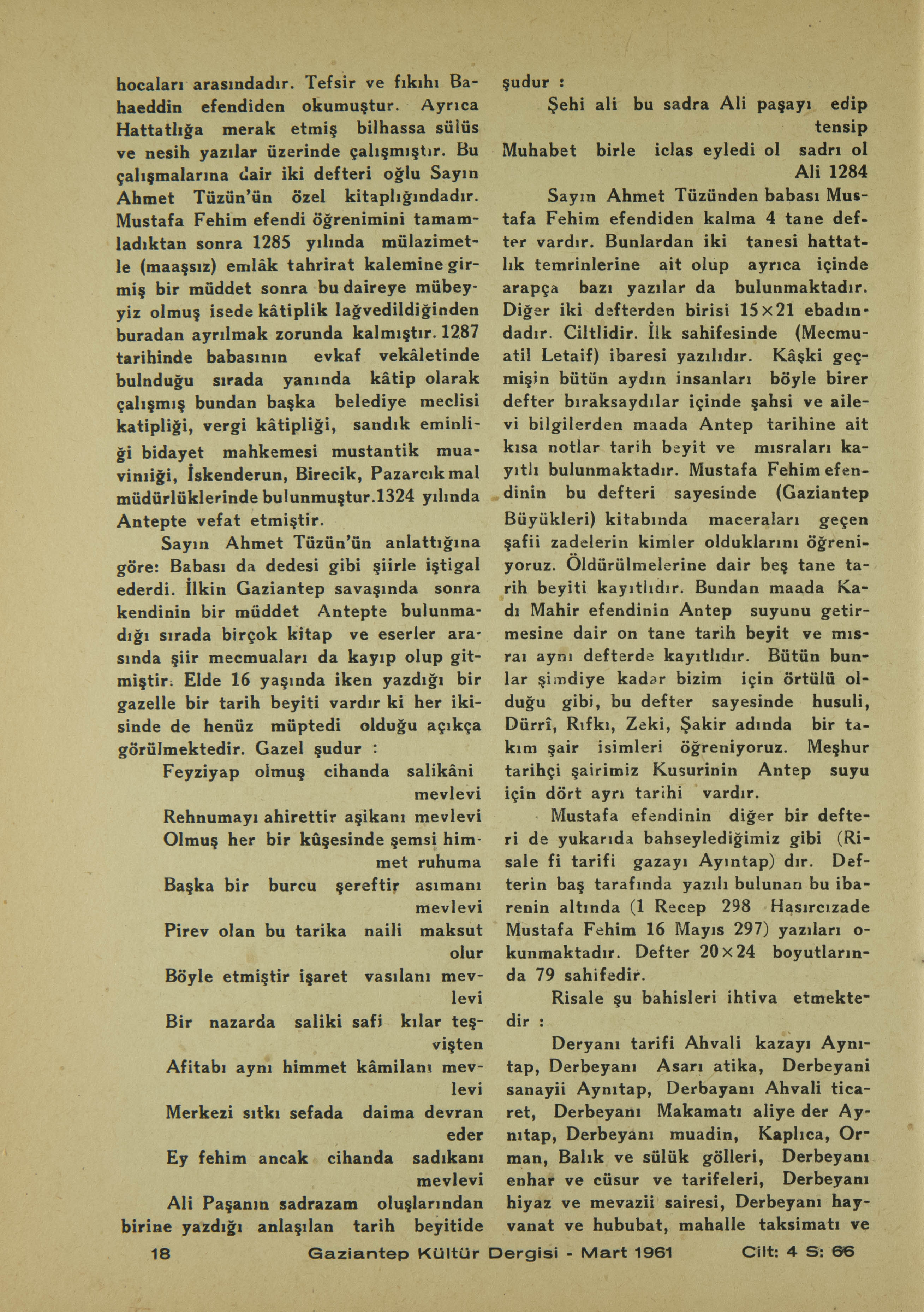 Sayın Ahmet Tüzünden babası Mustafa Fehim efendiden kalma 4 tane defter vardır. Bunlardan iki tanesi hattatlık temrinlerine ait olup ayrıca içinde arapça bazı yazılar da bulunmaktadır. Diğer iki defterden birisi 15x21 ebadındadır. Ciltlidir. İlk sahifesinde (Mecmuatil Letaif) ibaresi yazılıdır. Kâşki geçmişin bütün aydın insanları böyle birer defter bıraksaydılar içinde şahsi ve ailevi bilgilerden maada Antep tarihine ait kısa notlar tarih beyit ve mısraları kayıtlı bulunmaktadır. Mustafa Fehim efendinin bu defteri sayesinde (Gaziantep Büyükleri) kitabında maceraları geçen şafii zadelerin kimler olduklarını öğreniyoruz. Öldürülmelerine dair beş tane tarih beyiti kayıtlıdır. Bundan maada Kadı Mahir efendinin Antep suyunu getirmesine dair on tane tarih beyit ve mısraı aynı defterde kayıtlıdır. Bütün bunlar şimdiye kadar bizim için örtülü olduğu gibi, bu defter sayesinde husuli, Dürrî, Rıfkı, Zeki, Şakir adında bir takım şair isimleri öğreniyoruz. Meşhur tarihçi şairimiz Kusurinin Antep suyu için dört ayrı tarihi vardır.