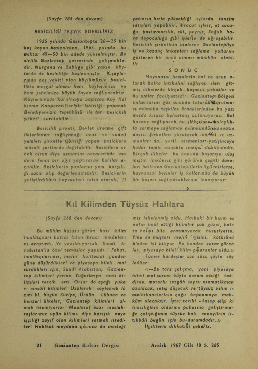 Hayvansal besinlerin bol ve ucuz olarak halka intikalini sağlayan ileri gitmiş ülkelerde birçok başarılı şirketler va kurumlar faaliyettedir. Gaziantep Bölgesi imkanlarını göz önünde tutarak kurulması mümkün teşkilat örneklerinden bu yazımızda kısaca bahsetmiş bulunuyoruz. Bol kazanç sağlıyacak bu şirketlere kolaylıkla sermaye sağlamak mümkündür kanaatindeyiz. Şirketleri yürütecek idareci ve uzmanları da yerlielemanlar yetişinceye kadar temin etmekte imkân dahilindedir. Birçok ülkeler bu konuda başarıya ulaşmıştır. İmkânsız gibi görülen çeşitli davaları halleden Gazianteplilerin ilgilenirlerse, hayvansal besinler iş kollarında da büyük bir başarı sağlıyacaklarına inanıyoruz.
