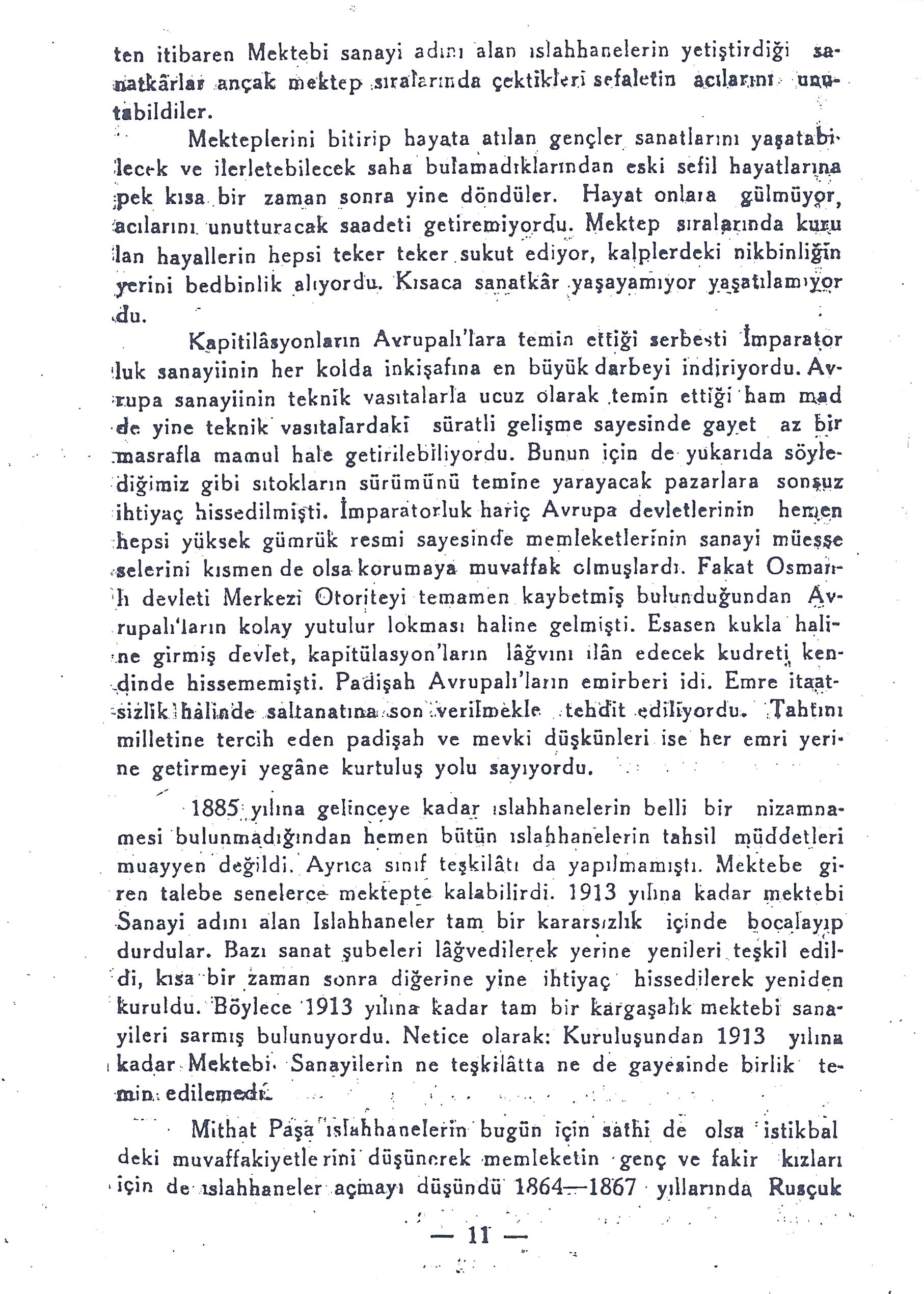 Yalnız ordu ve elbise ihtiyacını karşılamak gayesile açılan kız ıslahhanelerinde ve kız mektebi sanayilerinde de belli bir tahsil programı aramak saflık olur.