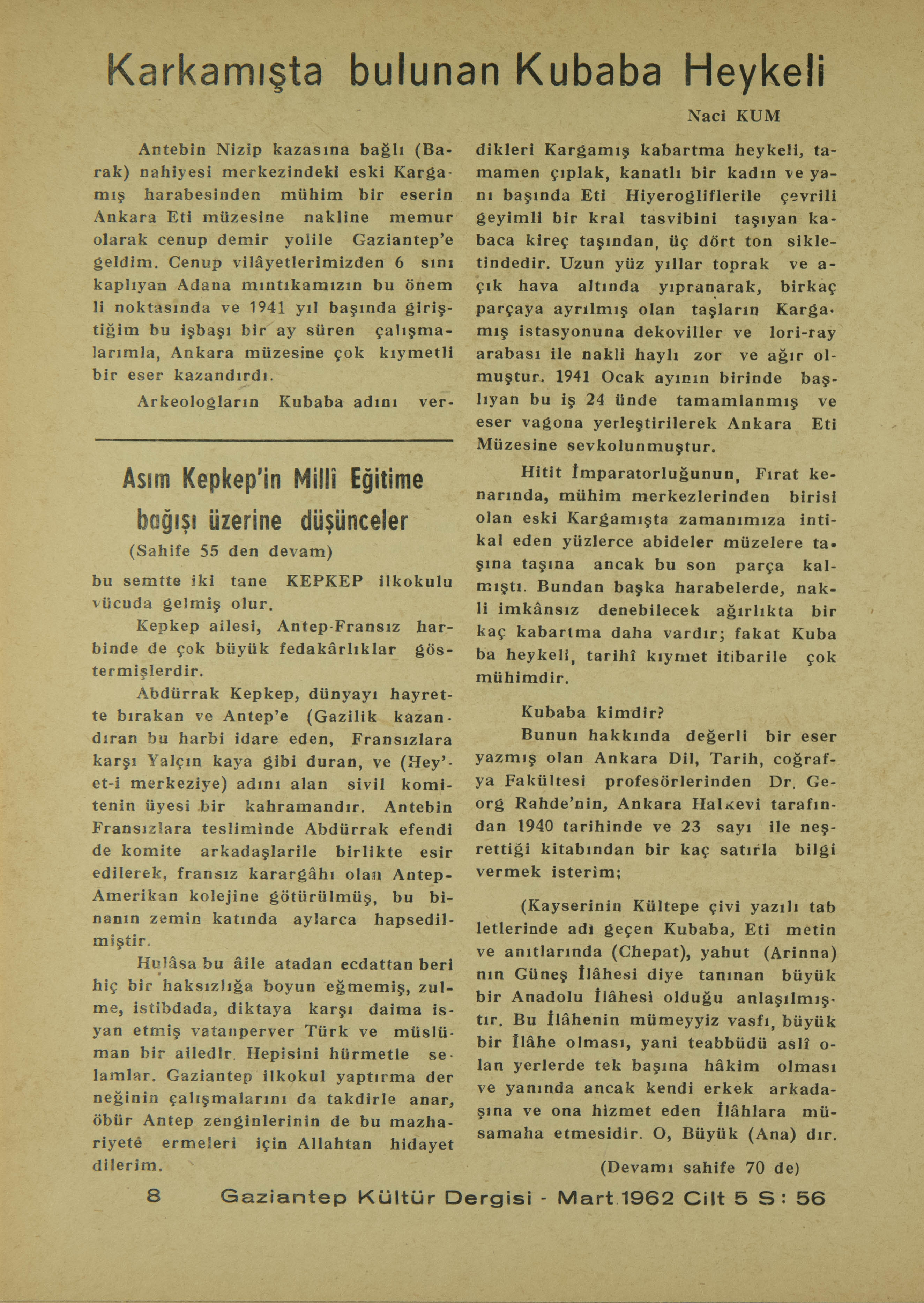 Antep’in Nizip kazasına bağlı (Barak) nahiyesi merkezindeki eski Kargamış harabesinden mühim bir eserin Ankara Eti müzesine nakline memur olarak cenup demir yolile Gaziantep’e geldim. Cenup vilâyetlerimizden 6 sını kaplıyan Adana mıntıkamızın bu önemli noktasında ve 1941 yıl başında giriştiğim bu işbaşı bir ay süren çalışmalarımla, Ankara müzesine çok kıymetli bir eser kazandırdı.