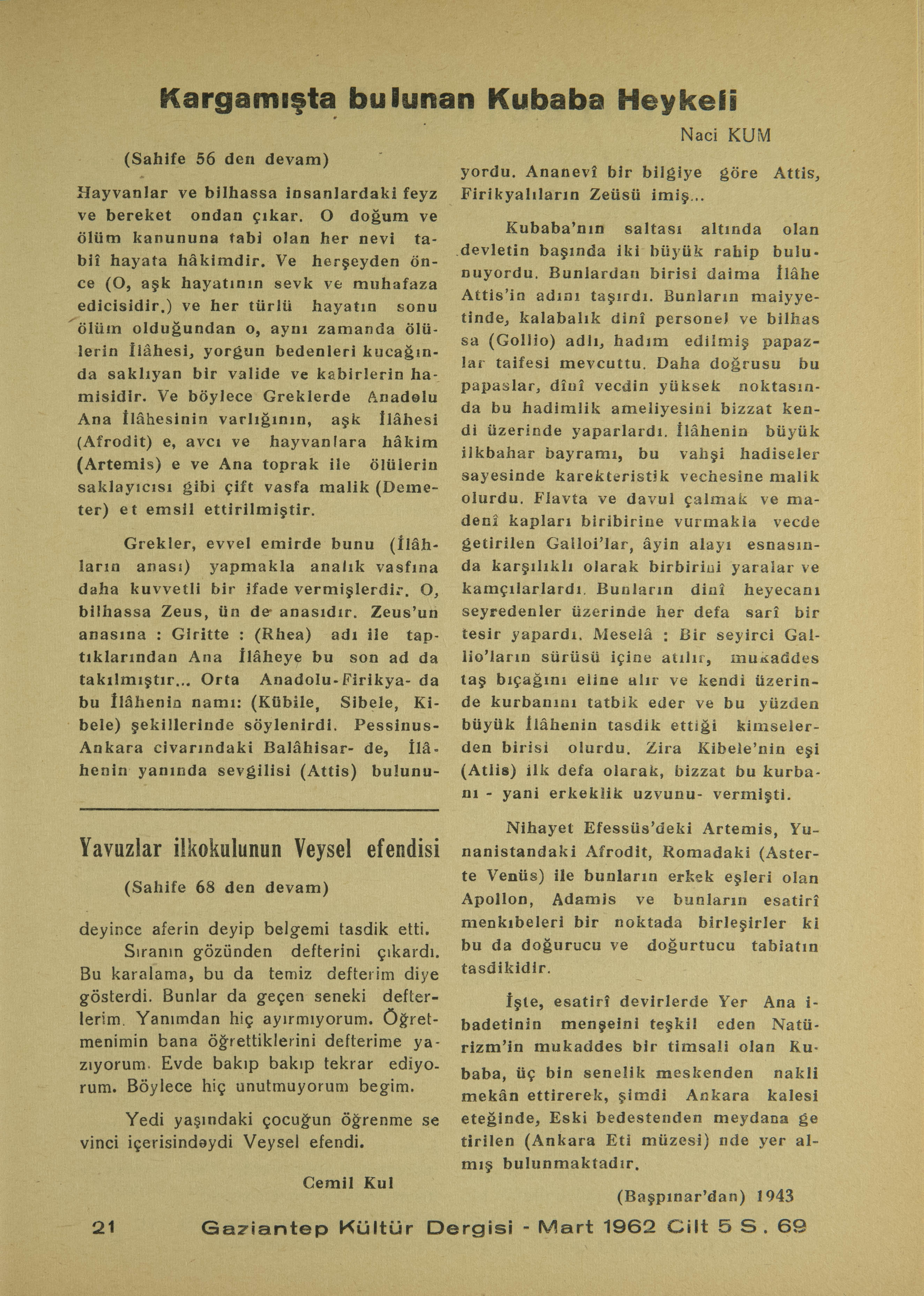 Grekler, evvel emirde bunu (İlâhların anası) yapmakla analık vasfına daha kuvvetli bir ifade vermişlerdir. O, bilhassa Zeus, ün de anasıdır. Zeus’un anasına: Giritte: (Rhea) adı ile taptıklarından Ana İlâheye bu son ad da takılmıştır... Orta Anadolu-Firikya’da bu İlâhenin namı: (Kübile, Sibele, Kibele) şekillerinde söylenirdi. Pessinus-Ankara civarındaki Balâhisar- de, İlâhenin yanında sevgilisi (Attis) bulunuyordu. Ananevî bir bilgiye göre Attis, Firikyalıların Zeüsü imiş..