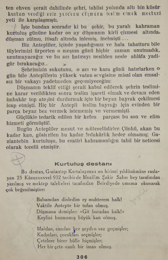 Bu destan, Gaziantep kurtuluşunun on birinci yıldönümüne rastlayan 25 Kânunuevvel 932 tarihinde Muallim Şakir Sabrı Bey tarafından yazılmış ve mektep talebeleri tarafından belediyede umuma okunarak, çok beğenilmiştir: