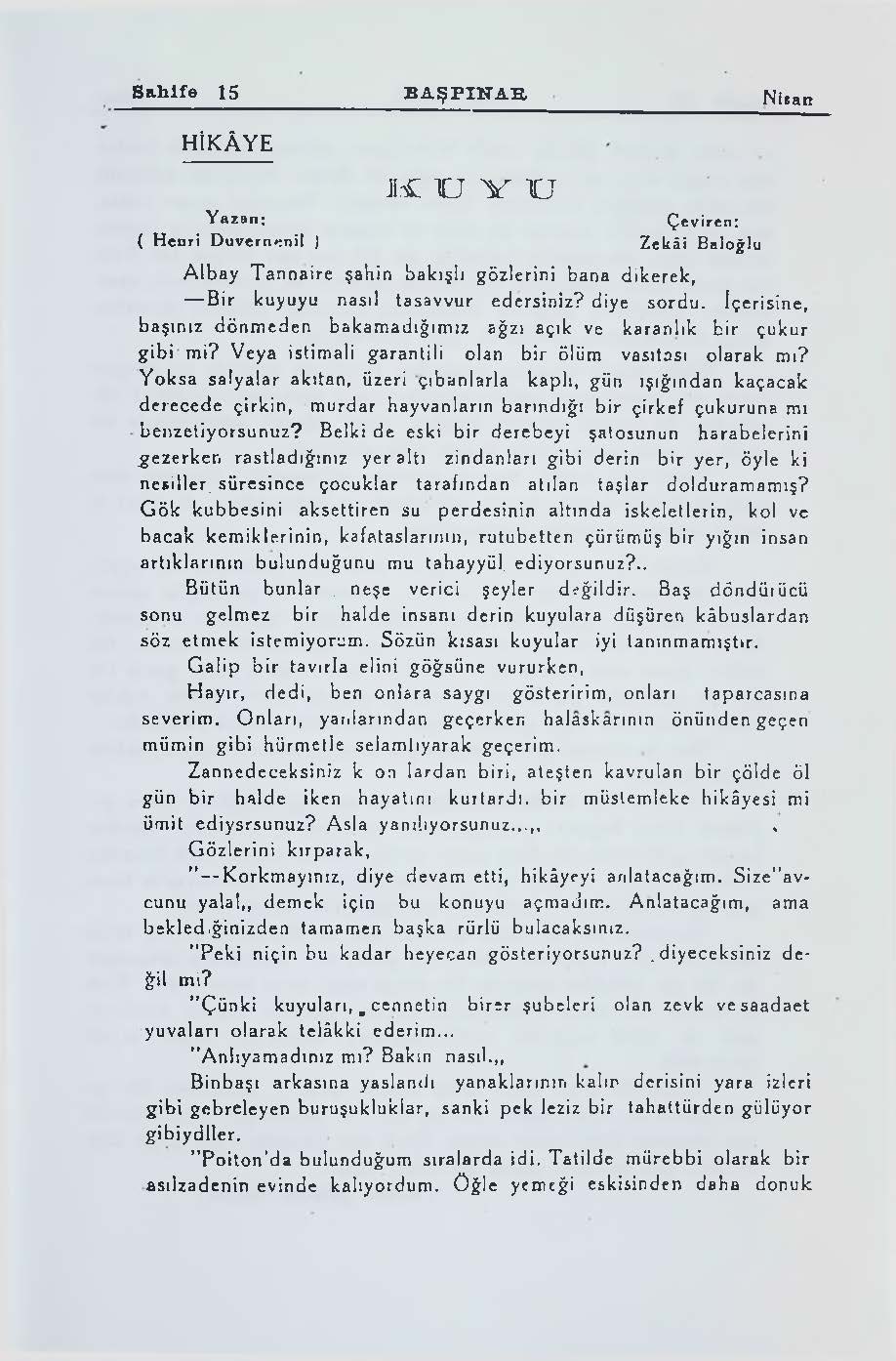 — Bir kuyuyu nasıl tasavvur edersiniz? diye sordu. İçerisine, başınız dönmeden bakamadığımız ağzı açık ve karanlık bir çukur gibi mi? Veya istimali garantili olan bir ölüm vasıtası olarak mı? Yoksa salyalar akıtan, üzeri çıbanlarla kaplı, gün ışığından kaçacak derecede çirkin, murdar hayvanların barındığı bir çirkef çukuruna mı benzetiyorsunuz? Belki de eski bir derebeyi şatosunun harabelerini gezerken rastladığınız yeraltı zindanları gibi derin bir yer; öyle ki nesiller, süresince çocuklar tarafından atılan taşlar dolduramamış... Gök kubbesini aksettiren su perdesinin altında iskeletlerin, kol ve bacak kemiklerinin, kafataslarının, rutubetten çürümüş bir yığın insan artıklarının bulunduğunu mu tahayyül, ediyorsunuz?