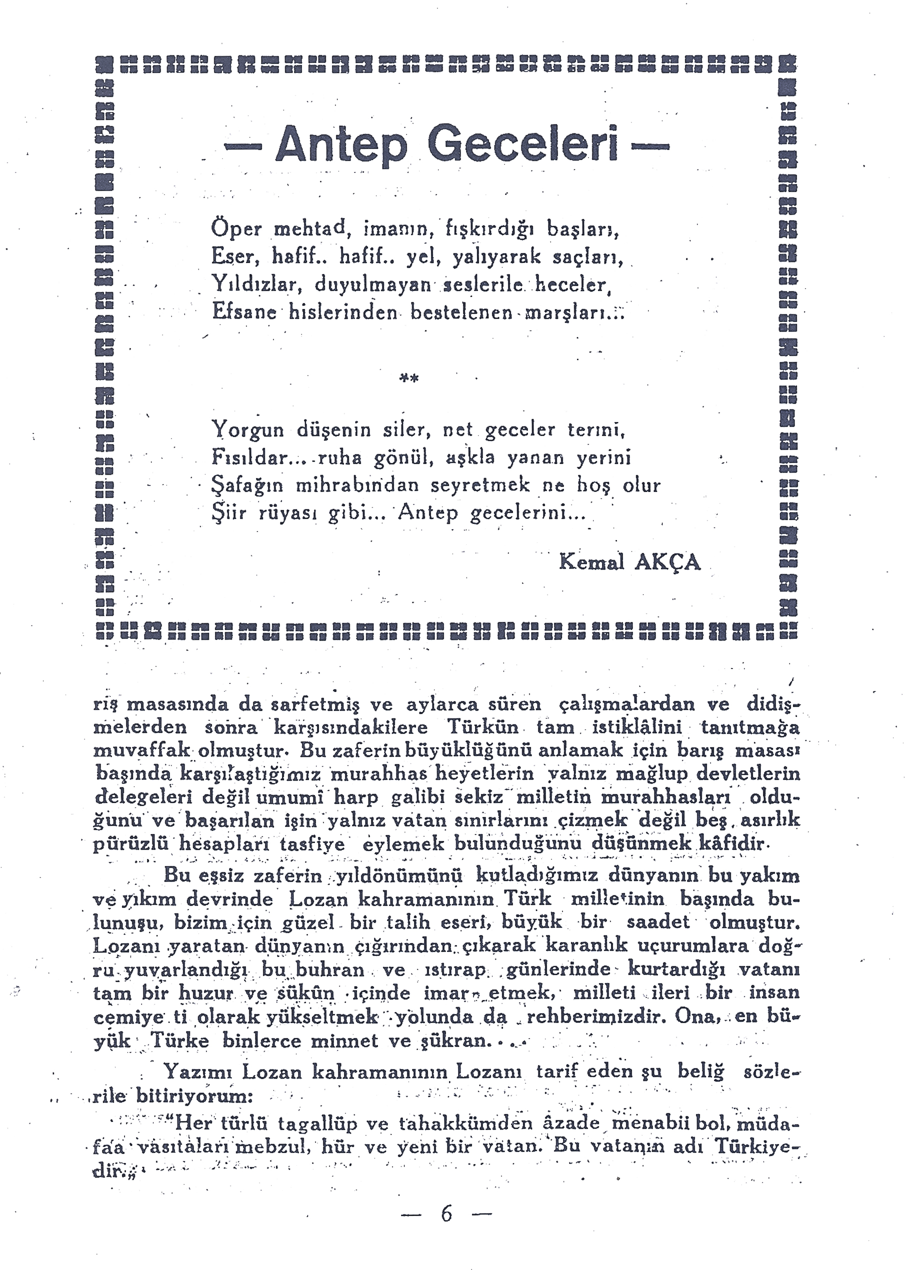 Türk milleti, dün Lozan zaferinin yıldönümünü kutladı. Yirmibir sene evvelki asil heyecan bütün tazeliği, bütün temizliği ile göğüsleri kabarttı; yüreklere ferah ve inşirah, kalplere neş’e ve iftihar verdi. Lozan, bir coğrafya ismi olmaktan çıkmış; millî tarihimizde (istiklâl)e alem olmuştur. Lozani Türk istiklâlilinin hücceti, siyasî zaferlerimizin şaheseridir. Lozan, birinci dünya harbinin mağrur ve mütehakkim galiplerine mağlup Osmanlı imparatorluğu enkazından fışkıran genç, gürbüz ve muzaffer Türkiyenin “mısakımilli” sini tanıttığı ahitnamenin ismidir.
