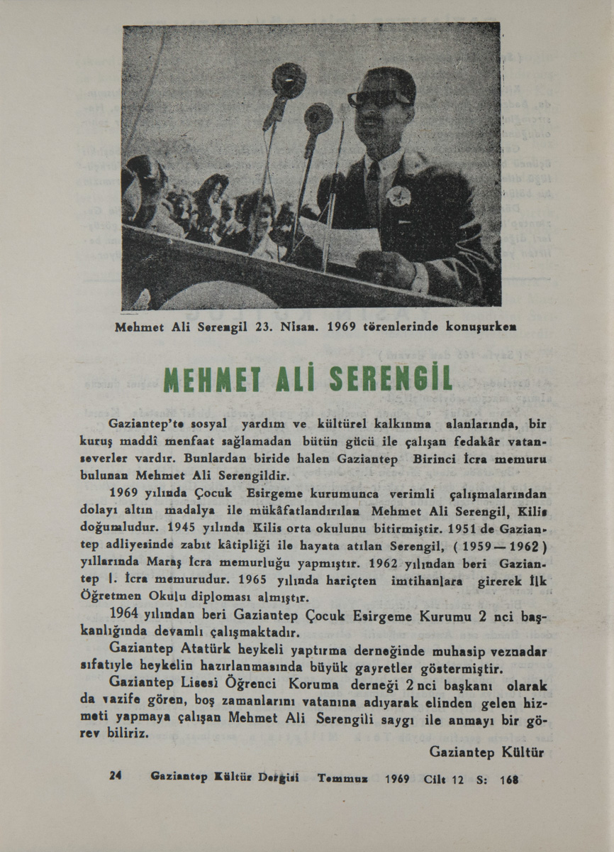 Gaziantep Lisesi Öğrenci Koruma derneği 2’nci başkanı olarak da vazife gören, boş zamanlarını vatanına adıyarak elinden gelen hizmeti yapmaya çalışan Mehmet Ali Serengili saygı ile anmayı bir görev biliriz.