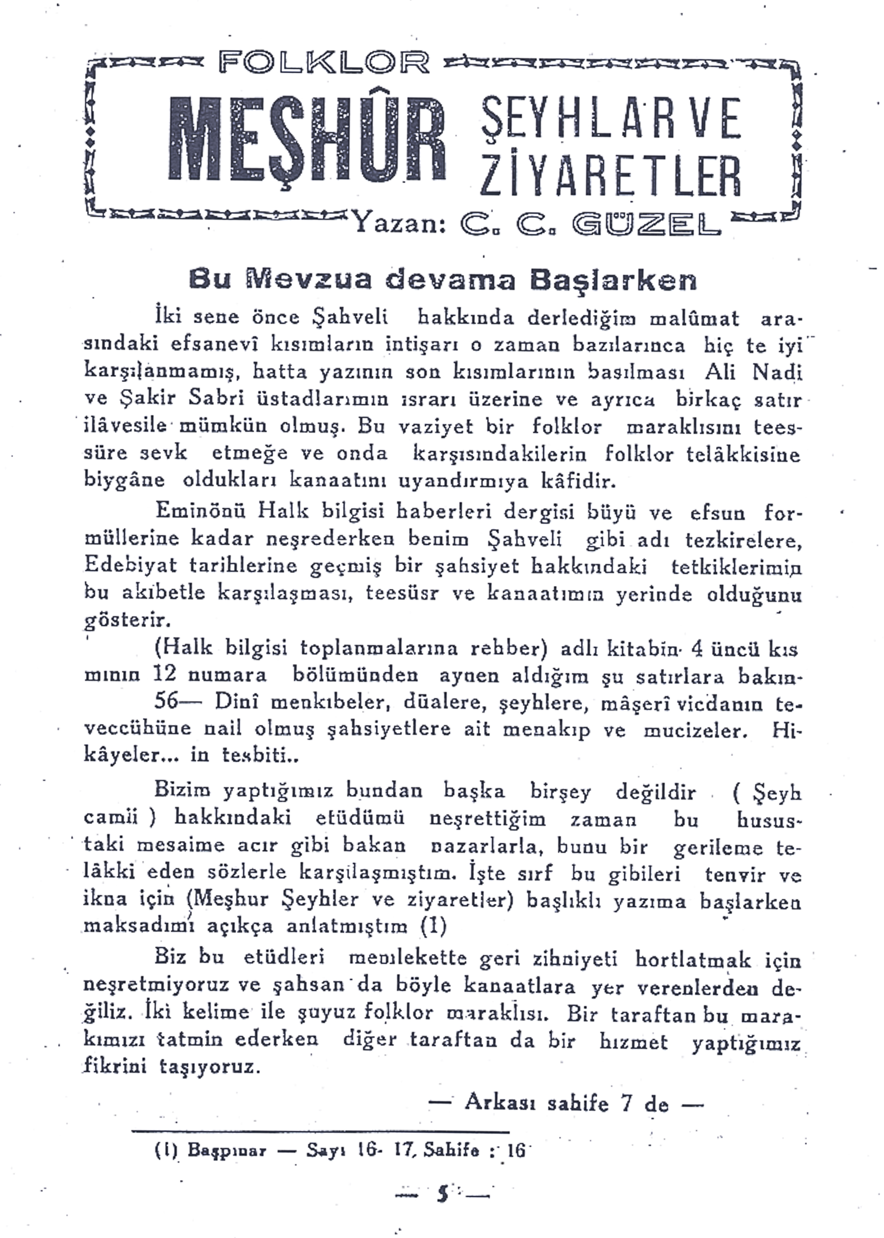 Bizim yaptığımız bundan başka birşey değildir . ( Şeyh camii ) hakkındaki etüdümü neşrettiğim zaman bu husustâki mesaime acır gibi bakan nazarlarla, bunu bir gerileme telâkki eden sözlerle karşılaşmıştım, işte sırf bu gibileri tenvir ve ikna için (Meşhur Şeyhler ve ziyaretler) başlıklı yazıma başlarken maksadımı açıkça anlatmıştım[1]