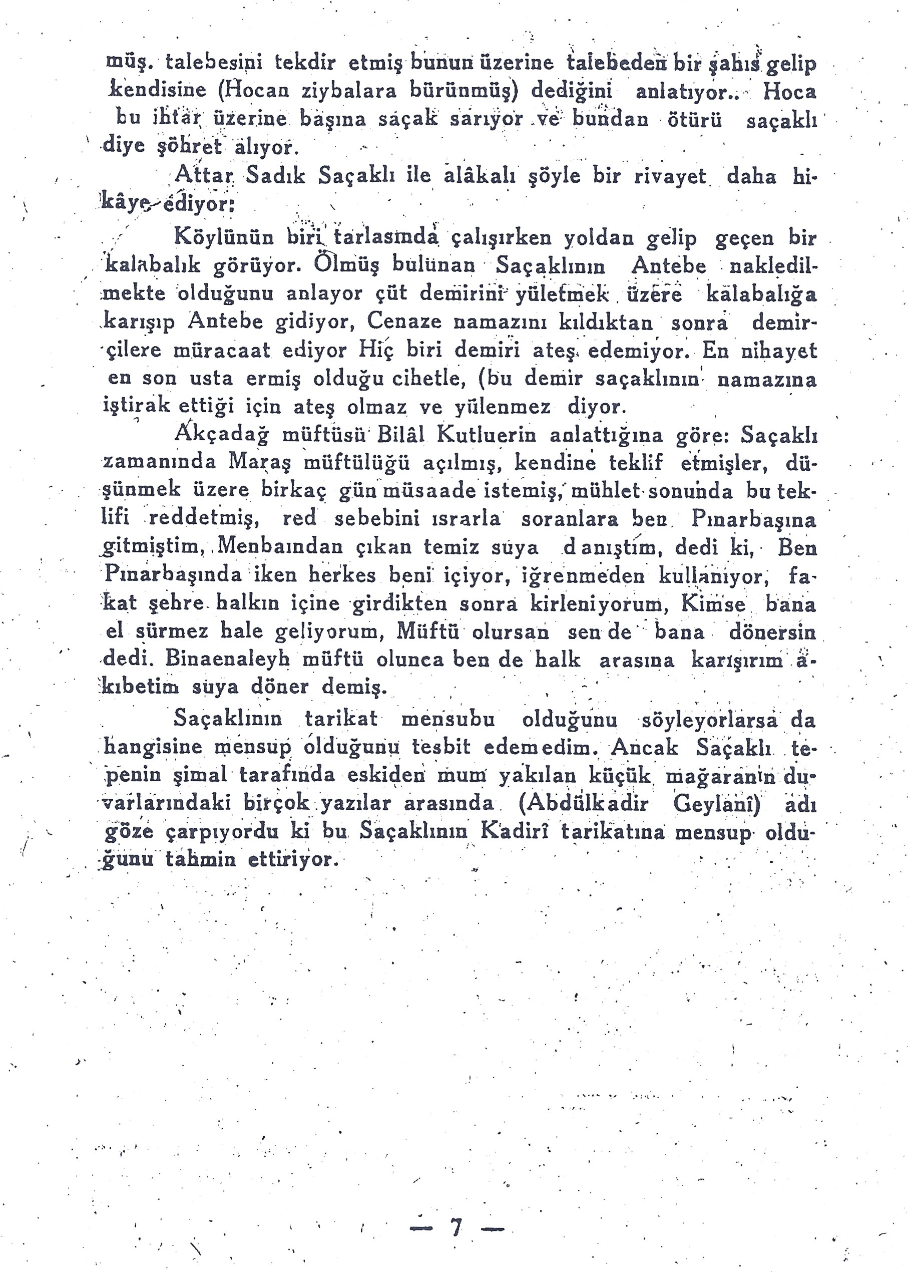 Arasada Attar Sadık: Saçaklı hakkında bildiklerini Bay Rifat Teymurdan farklı olarak şöyle anlatıyor: Saçaklı Antepte müderris iken talebeden birinin derslerle hiç meşgul olmadığını kaşıyle gözüyle işaretler yapıp konuşur bir vaziyet aldığını görmüş, talebesini tekdir etmiş bunun üzerine talebeden bir şahış gelip kendisine (Hocan ziybalara bürünmüş) dediğini anlatıyor. Hoca bu ihtar üzerine başına saçak sarıyor ve bundan ötürü şaçaklı diye şöhret alıyor.