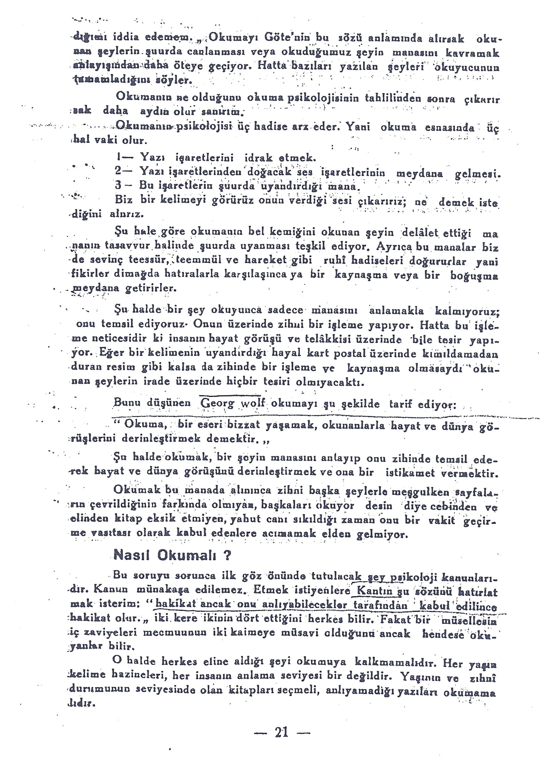 Okuma başlı başına bir meharet ve sanat işidir. Bunu münakaşe edecek değilim. Münevver ve münevver geçinen herkes bunu fark edecek kadar göz açıklığına maliktir. Hatta bu mevzua dokunuşum işin ehemmiyetine vukufsuzluktan doğan bir cesaret ve selâhiyetsizlik telâkki edecekler bulunacaktır. Fakat ben milletim için faydalı her şey de sonsuz bir cesarete sahip olmak lazım olduğu kanaatindeyim. Yalnız inandığım şeylerin doğru olmayan taraflarını ispat edeceklere şahsım ve milletim namına minnet duyarım.