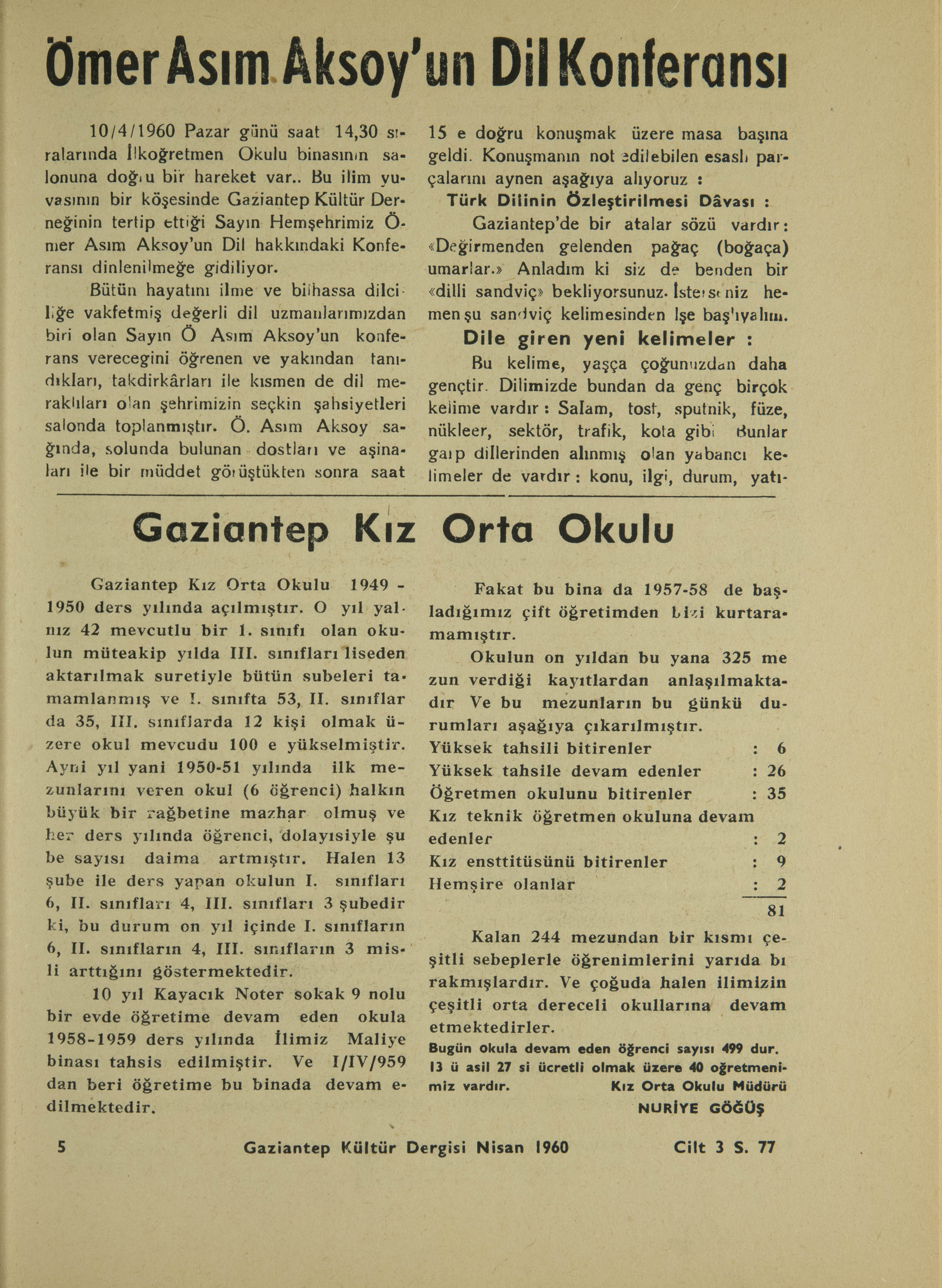 10 Nisan 1960 Pazar günü saat 14:30 sıralarında İlk öğretmen Okulu binasının salonuna doğru bir hareket var. Bu ilim yuvasının bir köşesinde Gaziantep Kültür Derneği’nin tertip ettiği Sayın Hemşerimiz Ömer Asım Aksoy’un Dil hakkındaki Konferansı dinlememeğe gidiliyor.