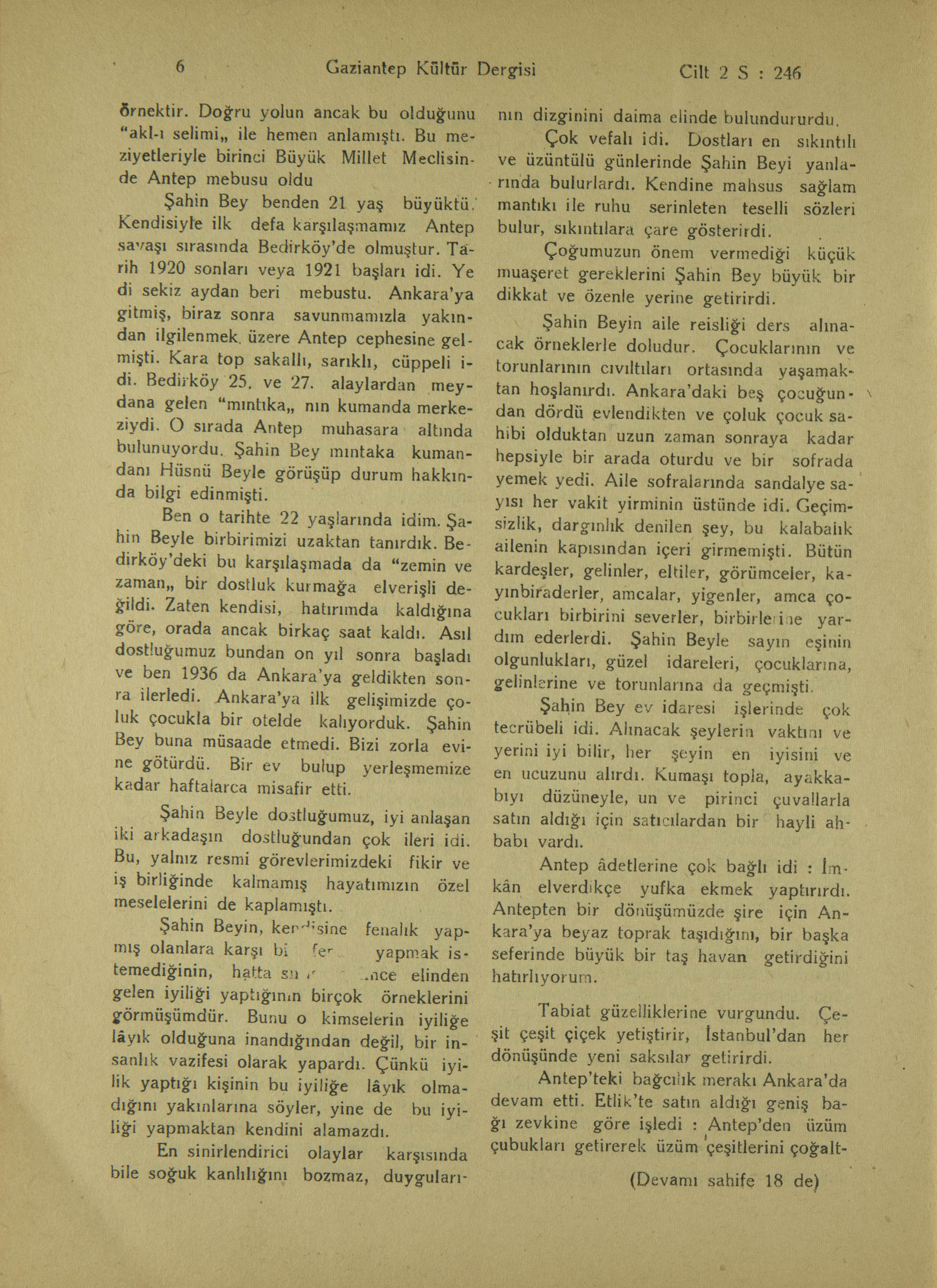 Şahin Bey benden 21 yaş büyüktü. Kendisiyle ilk defa karşılaşmamız Antep savaşı sırasında Bedirköy’de olmuştur. Tarih 1920 sonları veya 1921 başları idi. Yedi sekiz aydan beri mebustu. Ankara’ya gitmiş, biraz sonra savunmamızla yakından ilgilenmek üzere Antep cephesine gelmişti. Kara top sakallı, sarıklı, cüppeli idi. Bedirköy 25. ve 27. alaylardan meydana gelen “mıntıka”nın kumanda merkeziydi. O sırada Antep muhasara altında bulunuyordu. Şahin Bey mıntaka kumandanı Hüsnü Beyle görüşüp durum hakkında bilgi edinmişti.