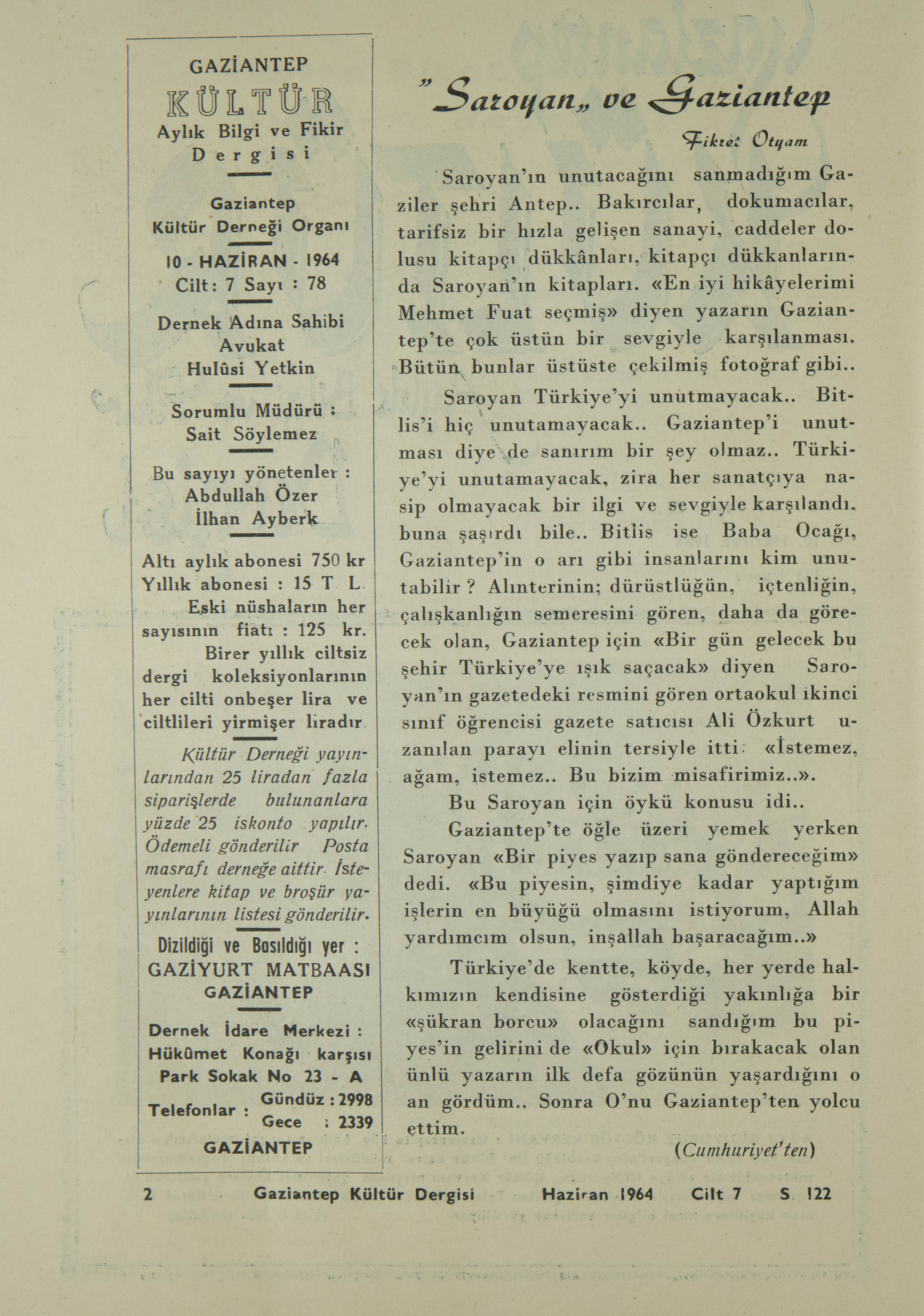 Saroyan’ın unutacağını sanmadığım Gaziler şehri Antep.. Bakırcılar, dokumacılar, tarifsiz bir hızla gelişen sanayi, caddeler dolusu kitapçı dükkânları, kitapçı dükkanlarında Saroyan’ın kitapları. “En iyi hikâyelerimi Mehmet Fuat seçmiş” diyen yazarın Gaziantep’te çok üstün bir sevgiyle karşılanması. Bütün bunlar üstüste çekilmiş fotoğraf gibi...