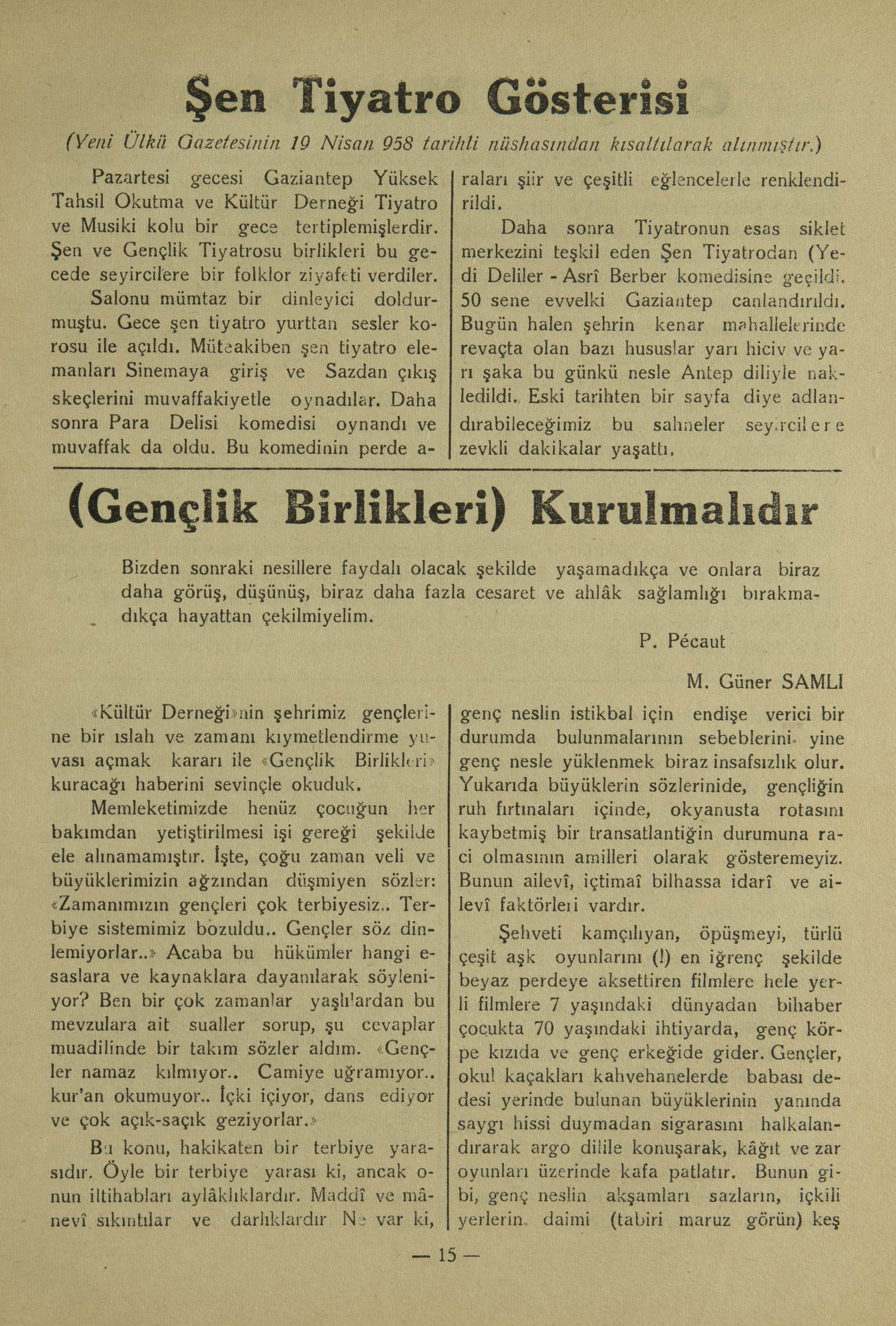Pazartesi gecesi Gaziantep Yüksek Tahsil Okutma ve Kültür Derneği Tiyatro ve Musiki kolu bir gece tertiplemişlerdir. Şen ve Gençlik Tiyatrosu birlikleri bu gecede seyircilere bir folklor ziyafeti verdiler. Salonu mümtaz bir dinleyici doldurmuştu. Gece şen tiyatro yurttan sesler korosu ile açıldı. Müteakiben şen tiyatro elemanları Sinemaya giriş ve sazdan çıkış skeçlerini muvaffakiyetle oynadılar. Daha sonra Para Delisi komedisi oynandı ve muvaffak da oldu. Bu komedinin perde araları şiir ve çeşitli eğlencelerle renklendirildi.