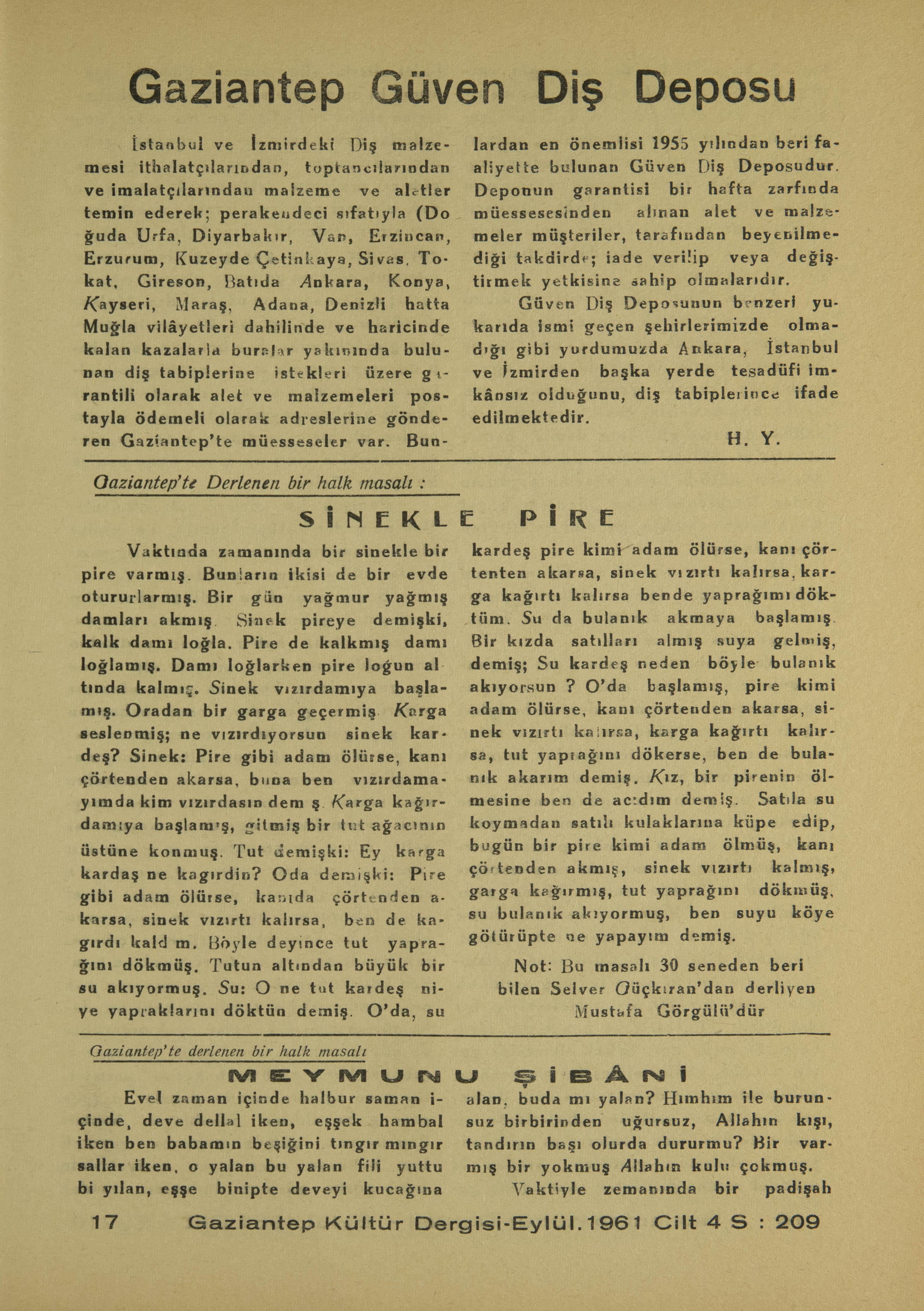Vaktında zamanında bir sinekle bir pire varmış. Bunların ikisi de bir evde otururlarmış. Bir gün yağmur yağmış damları akmış. Sinek pireye demişki, kalk damı loğla. Pire de kalkmış damı loğlamış. Damı loğlarken pire loğun altında kalmış. Sinek vızırdamıya başlamış. Oradan bir garga geçermiş Karga seslenmiş; ne vızırdıyorsun sinek kardeş? Sinek: Pire gibi adam ölürse, kanı çörtenden akarsa, buna ben vızırdamayımda kim vızırdasın demiş Karga kağırdamıya başlamış, gitmiş bir tut ağacının üstüne konmuş. Tut demişki: Ey karga kardaş ne kagırdin? Oda demişki: Pıre gibi adam ölürse, kanıda çörtenden akarsa, sinek vızırtı kalırsa, ben de kagırdı kaldım. Böyle deyince tut yaprağını dökmüş. Tutun altından büyük bir su akıyormuş. Su: O ne tut kardeş niye yapraklarını döktün demiş. O’da, su kardeş pire kimi adam ölürse, kanı çörtenten akarsa, sinek vızırtı kalırsa, karga kağırtı kalırsa bende yaprağımı döktüm. Su da bulanık akmaya başlamış. Bir kızda satılları almış suya gelmiş, demiş; Su kardeş neden böyle bulanık akıyorsun? O’da başlamış, pire kimi adam ölürse, kanı çörtenden akarsa, sinek vızırtı kağırsa, karga kağırtı kalırsa, tut yaprağını dökerse, ben de bulanık akarım demiş. Kız, bir pirenin ölmesine ben de acıdım demiş. Satıla su koymadan satılı kulaklarına küpe edip, bugün bir pire kimi adam ölmüş, kanı çörtenden akmış, sinek vızırtı kalmış, garga kağırmış, tut yaprağını dökmüş, su bulanık akıyormuş, ben suyu köye götürüpte ne yapayım demiş.