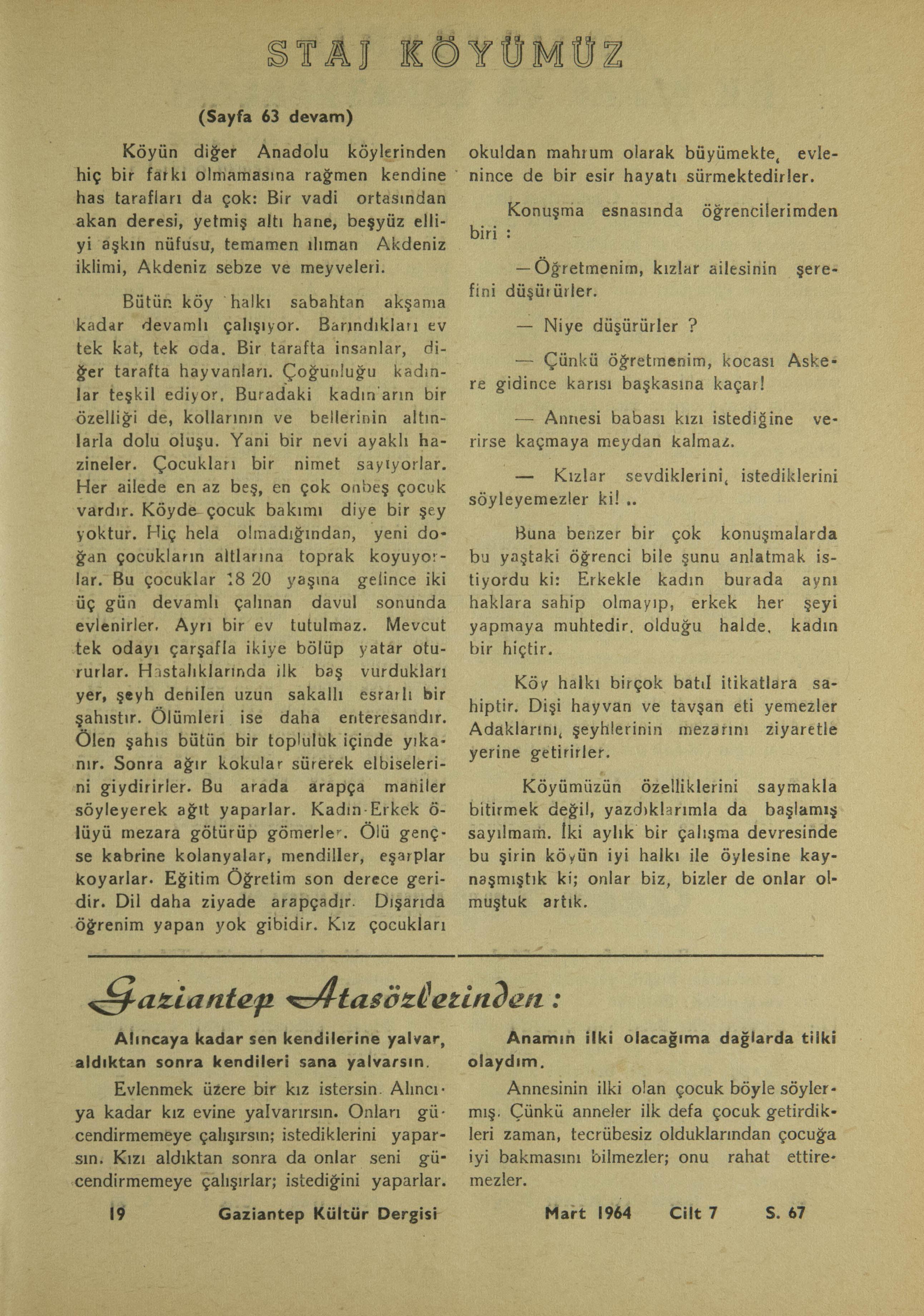 Köyümüzün özelliklerini saymakla bitirmek değil, yazdıklarımla da başlamış sayılmam. İki aylık bir çalışma devresinde bu şirin köyün iyi halkı ile öylesine kaynaşmıştık ki; onlar biz, bizler de onlar olmuştuk artık.