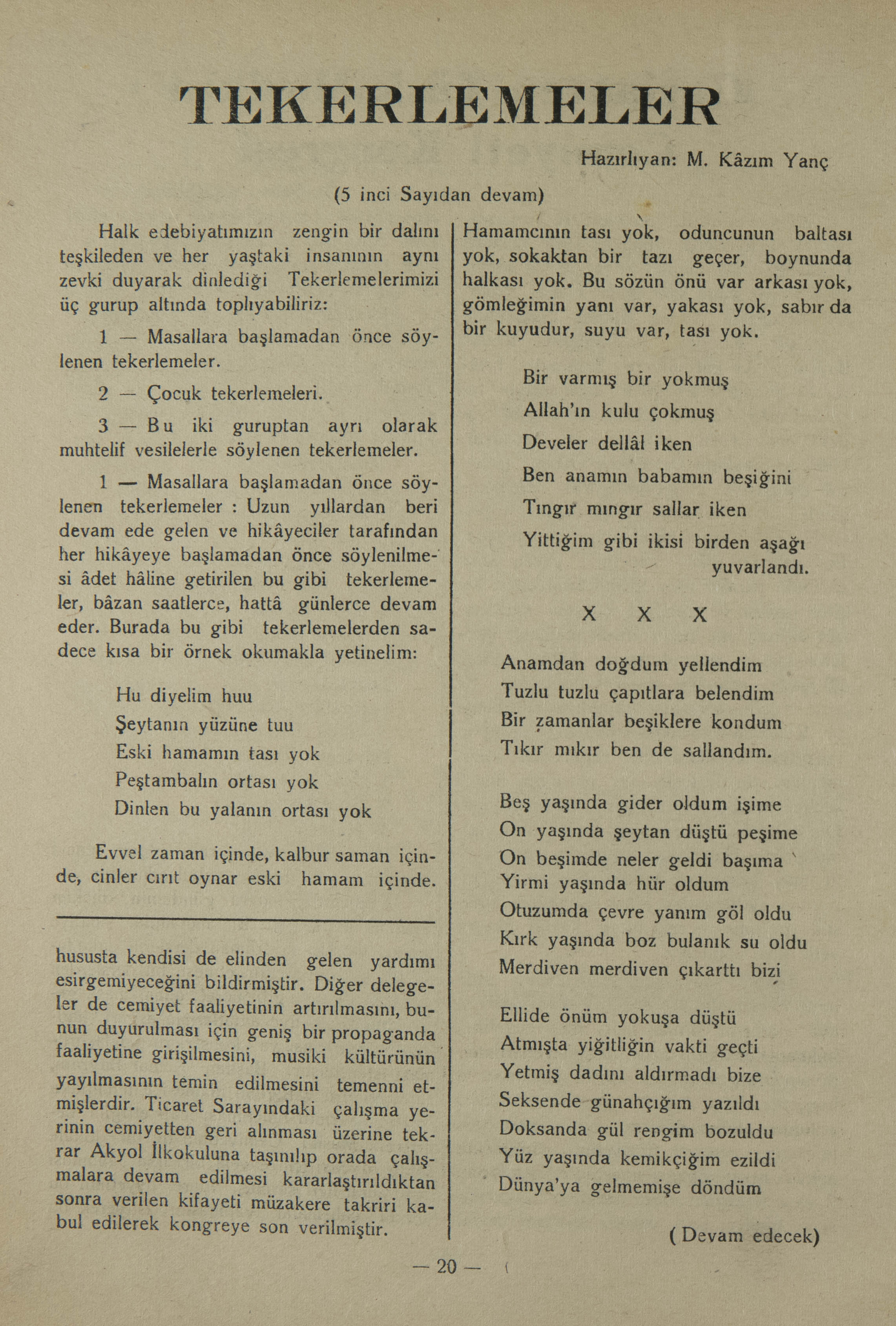 1- Masallara Başlamadan Önce Söylenen Tekerlemeler: Uzun yıllardan beri devam ede gelen ve hikâyeciler tarafından her hikâyeye başlamadan Önce söylenilmesi âdet hâline getirilen bu gibi tekerlemeler, bazen saatlerce, hattâ günlerce devam eder. Burada bu gibi tekerlemelerden sadece kısa bir örnek okumakla yetinelim: